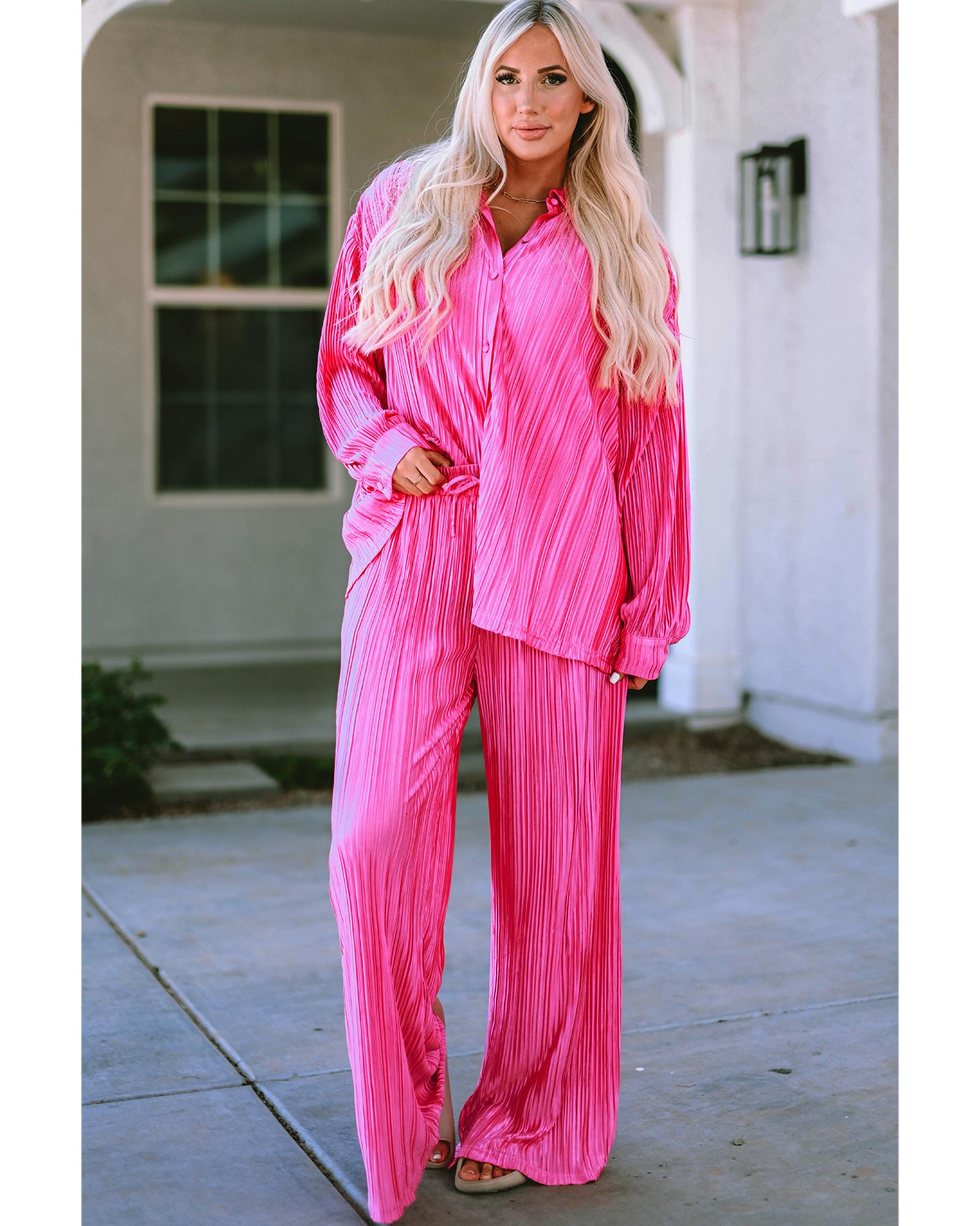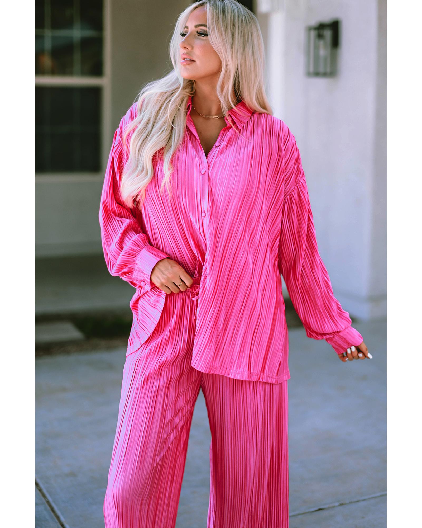 Rose Pleated Long Sleeve Shirt and Wide-Leg Pants Set – L