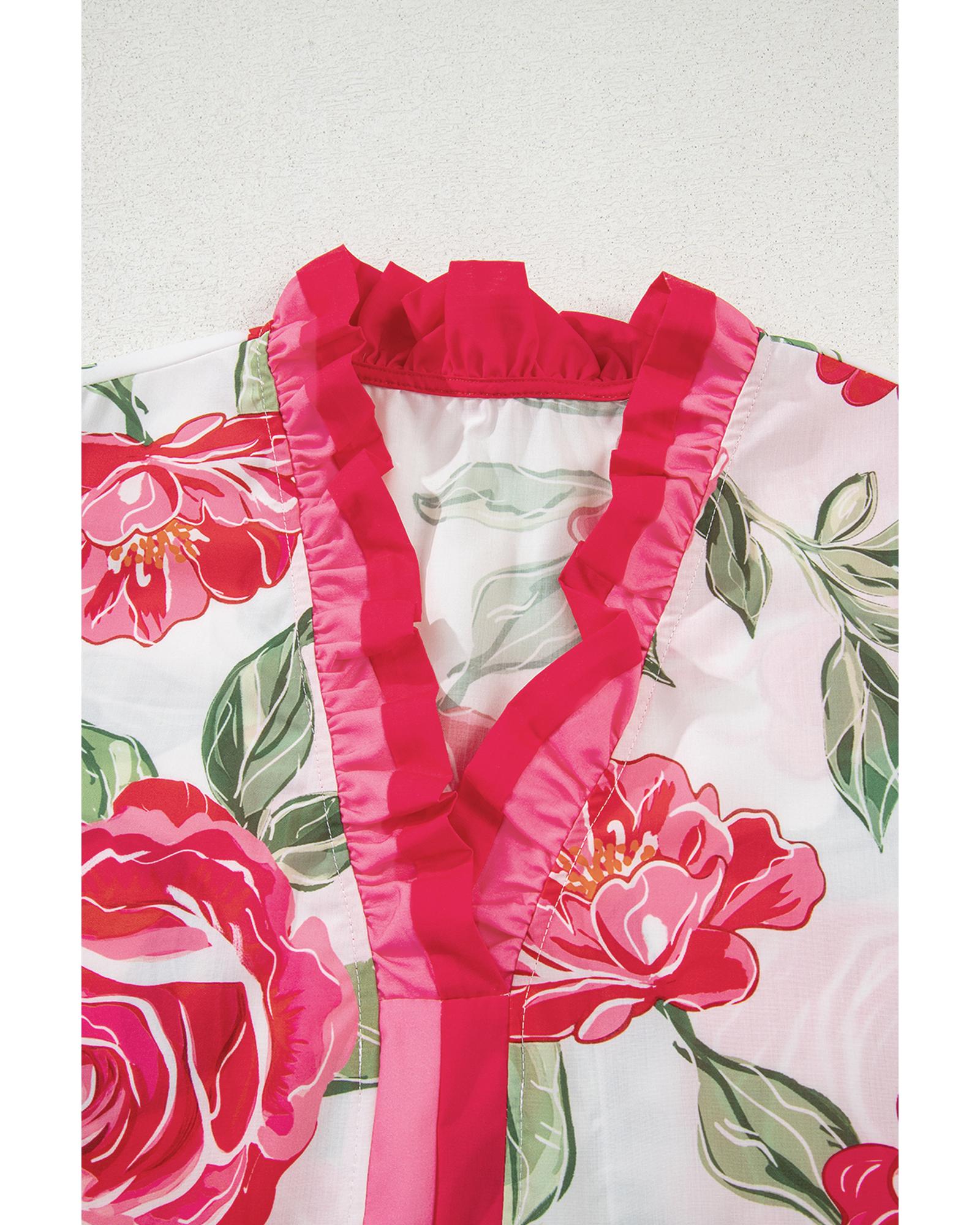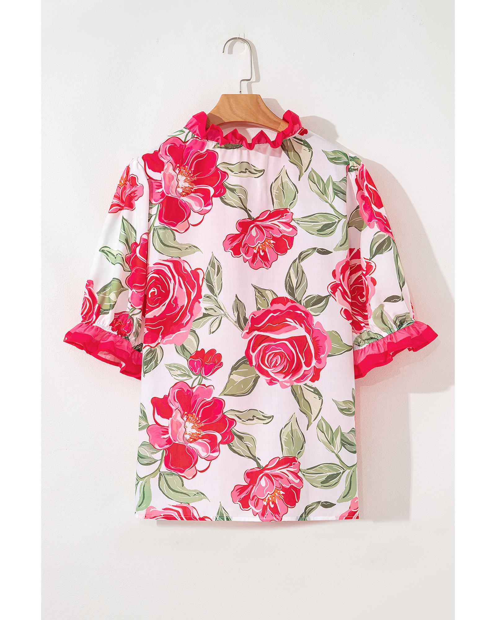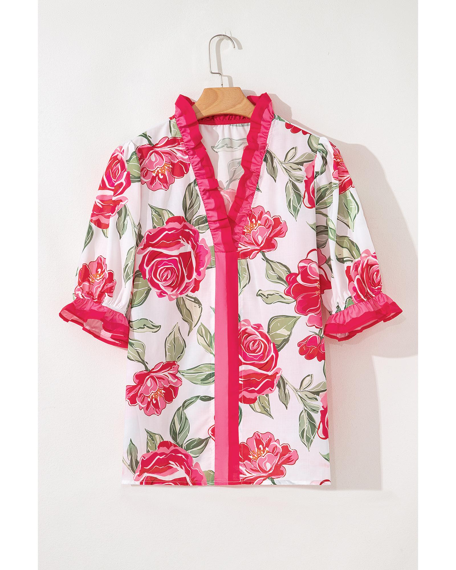 Rose Plus Size Floral Print Frilled Stripes Detail Short Sleeve Blouse – 4X