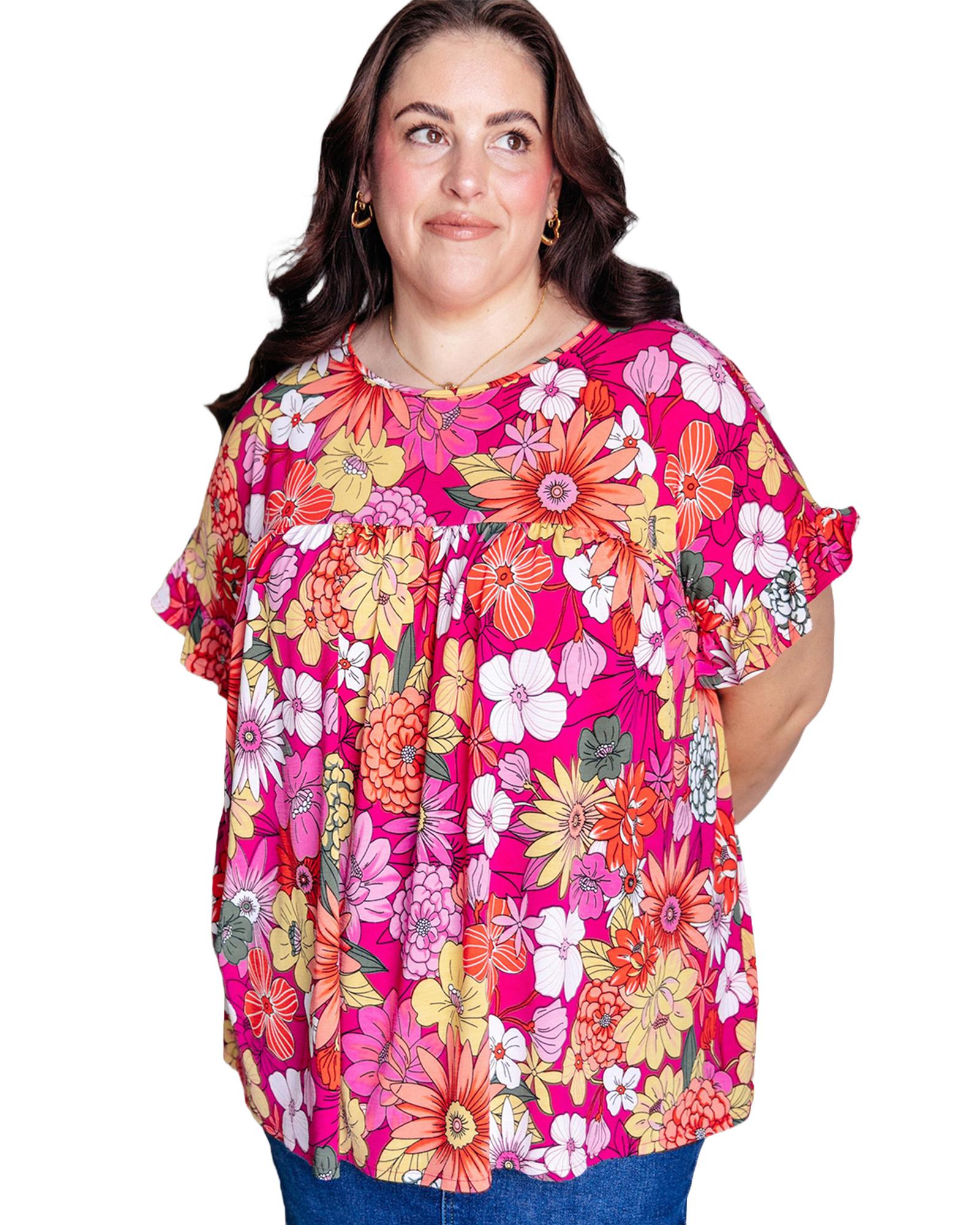 Rose Plus Size Floral Print Ruffle Short Sleeve Blouse – 2X