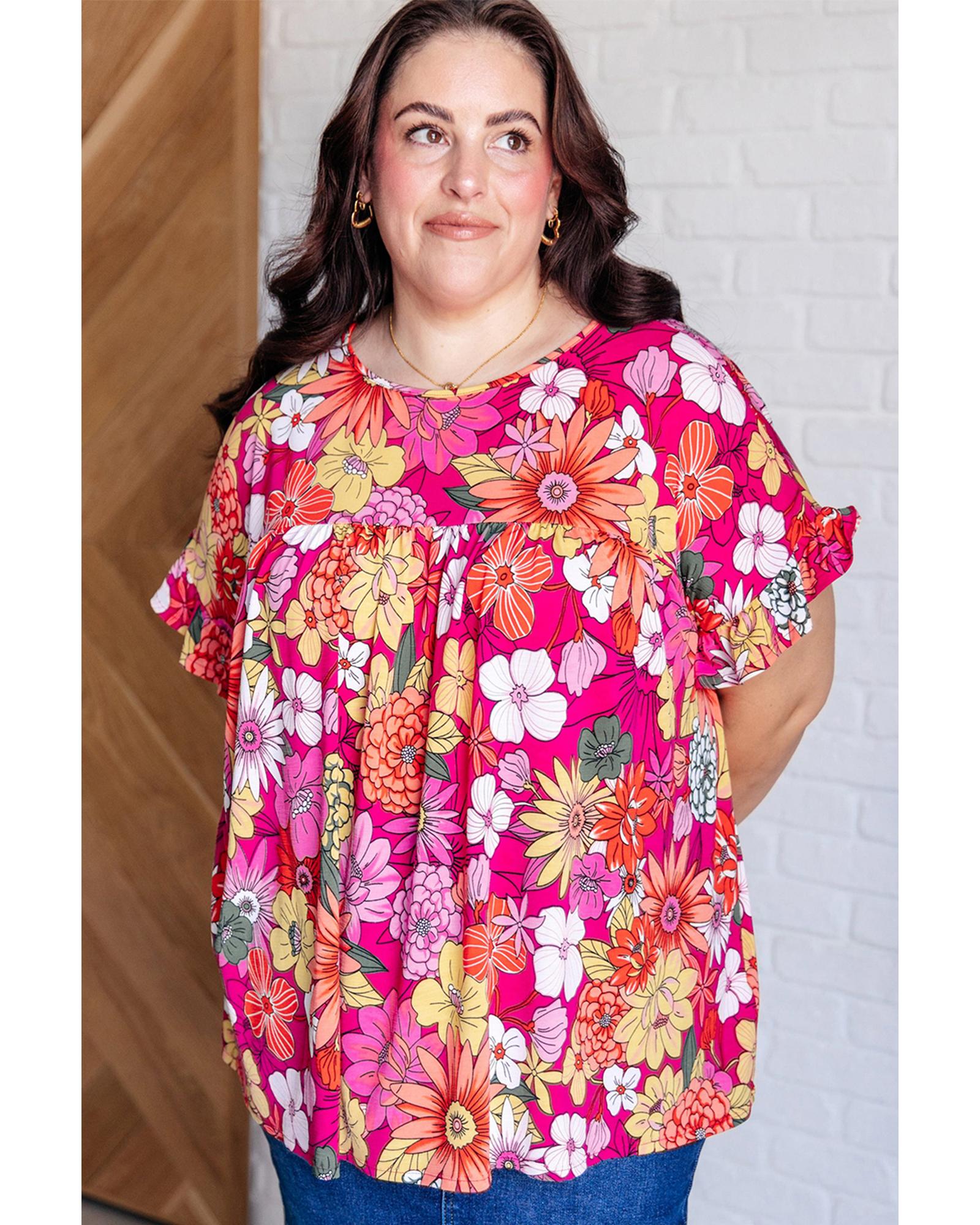 Rose Plus Size Floral Print Ruffle Short Sleeve Blouse – 4X