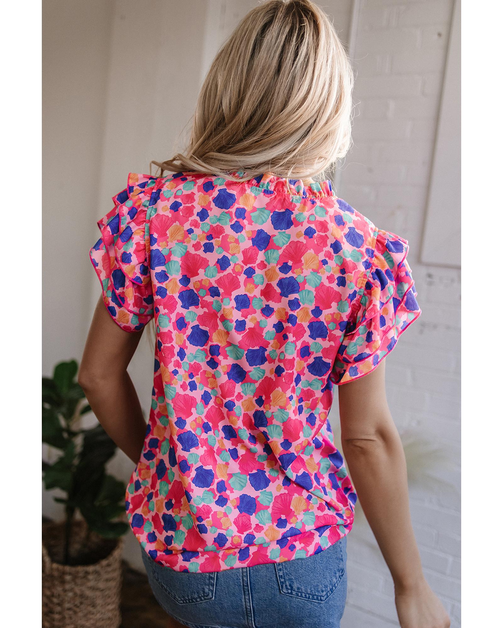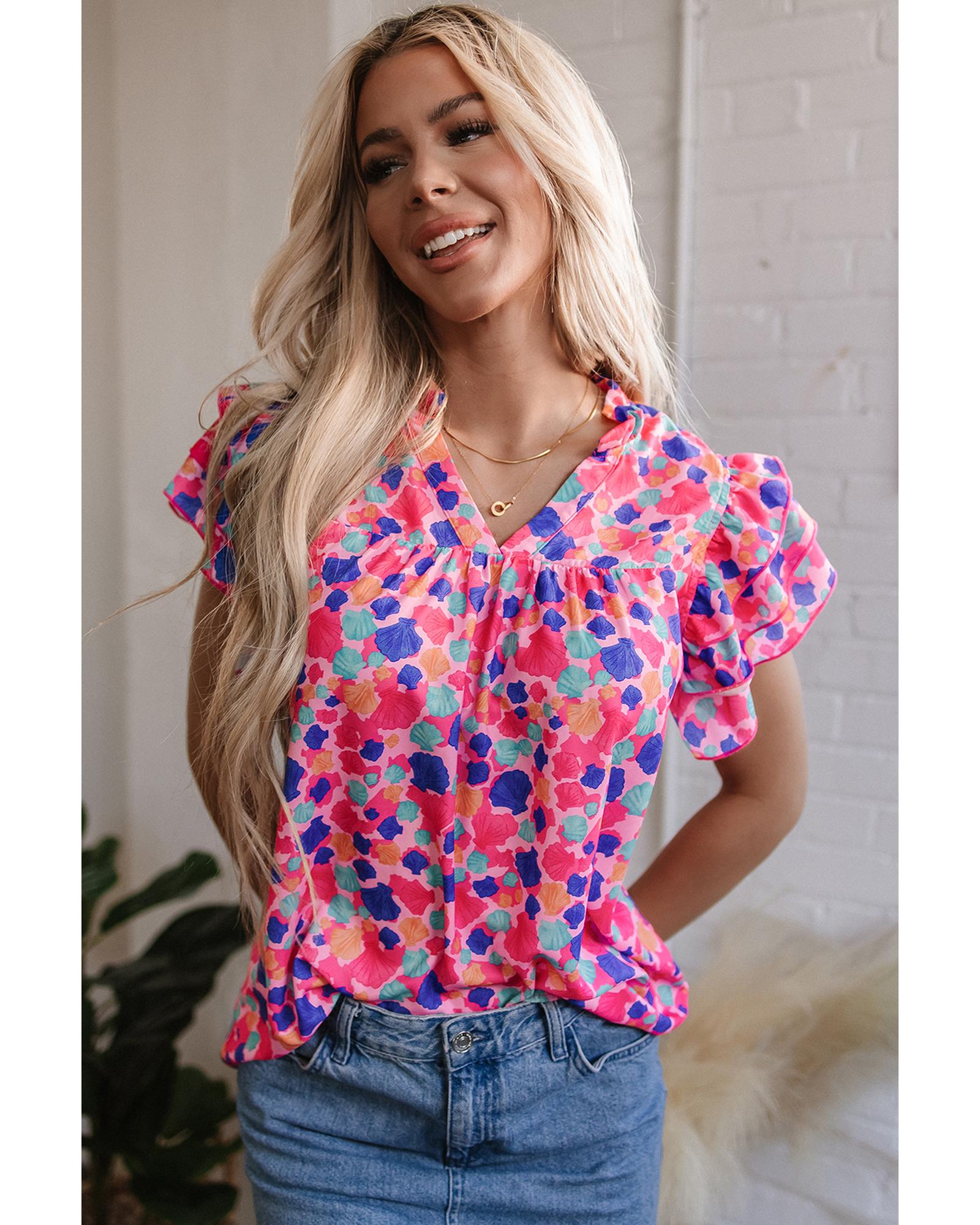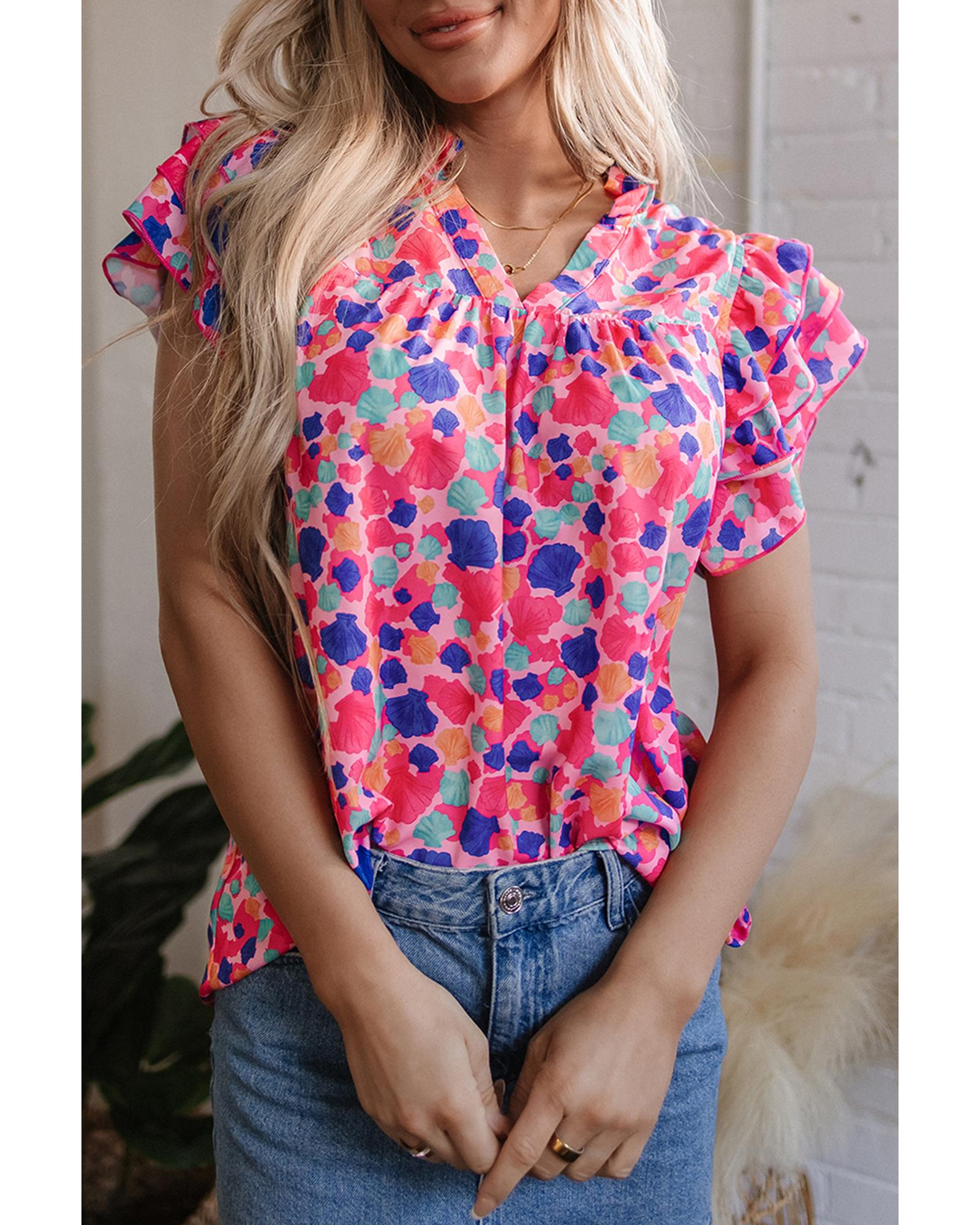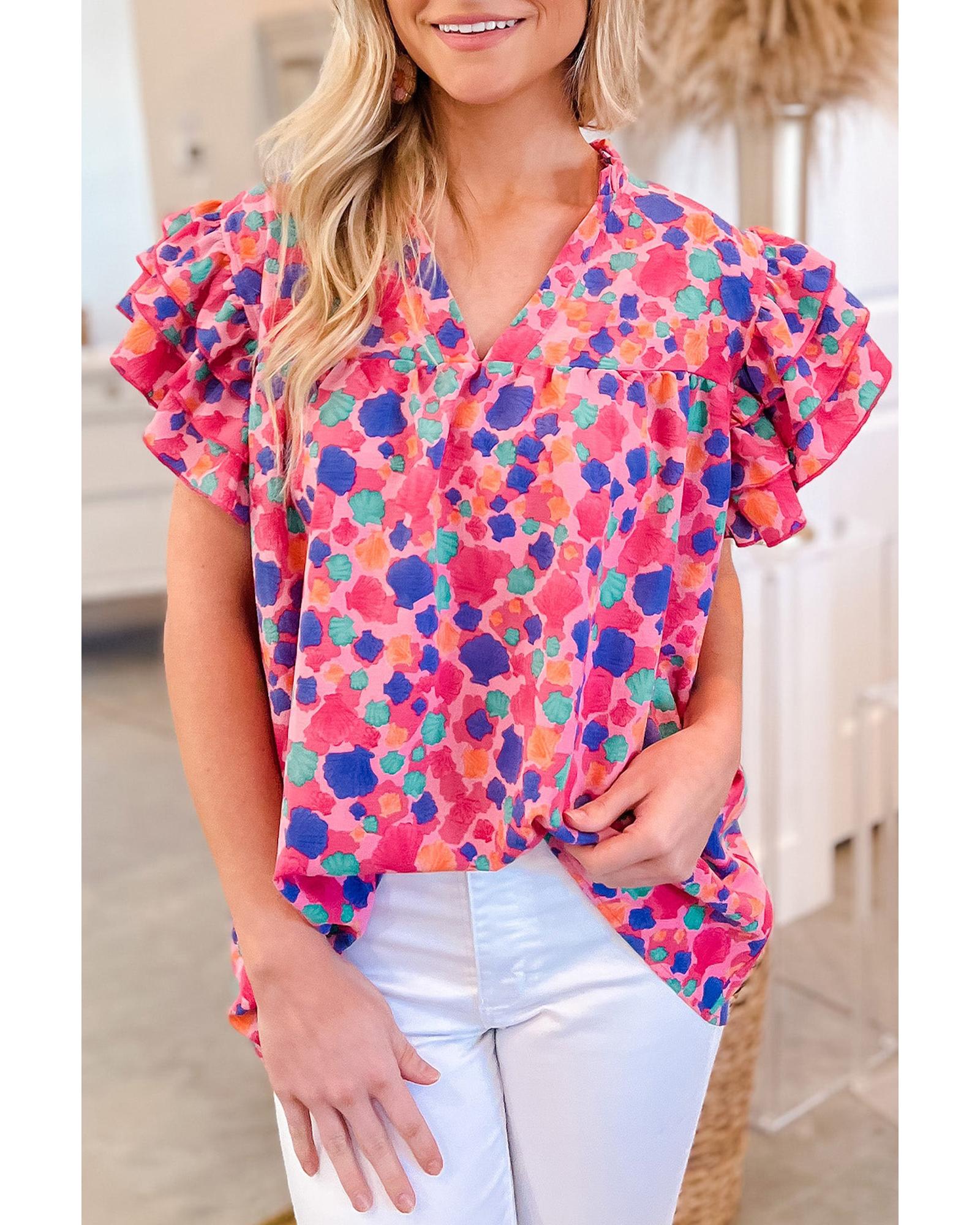 Rose Red Abstract Print Ruffled Sleeve V Neck Blouse – XL