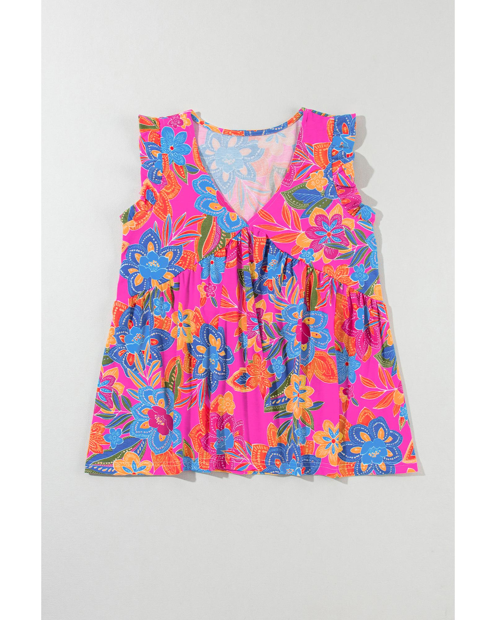 Rose Red Boho Pattern Print Flounce V Neck Tank Top – L