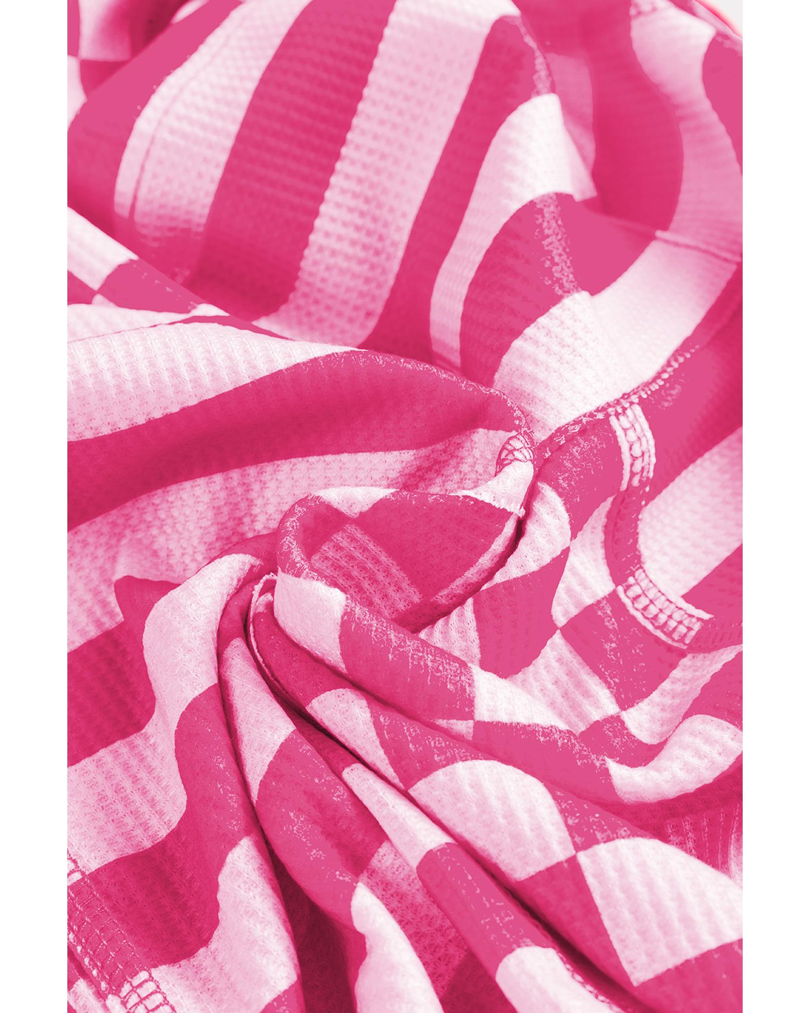 Rose Red Checkerboard Striped Patchwork Lantern Sleeve Pocketed Blouse – L