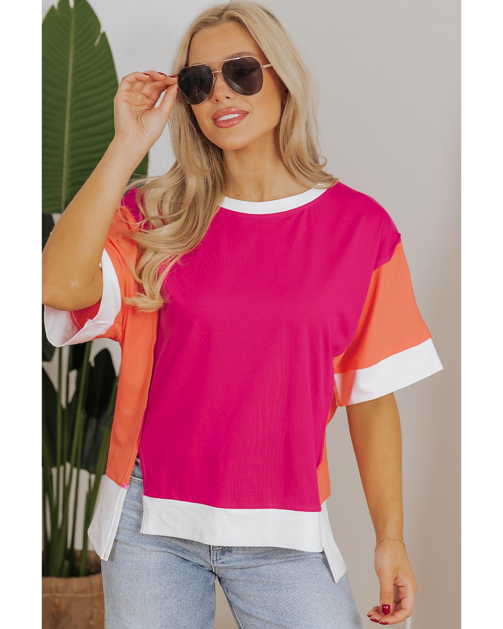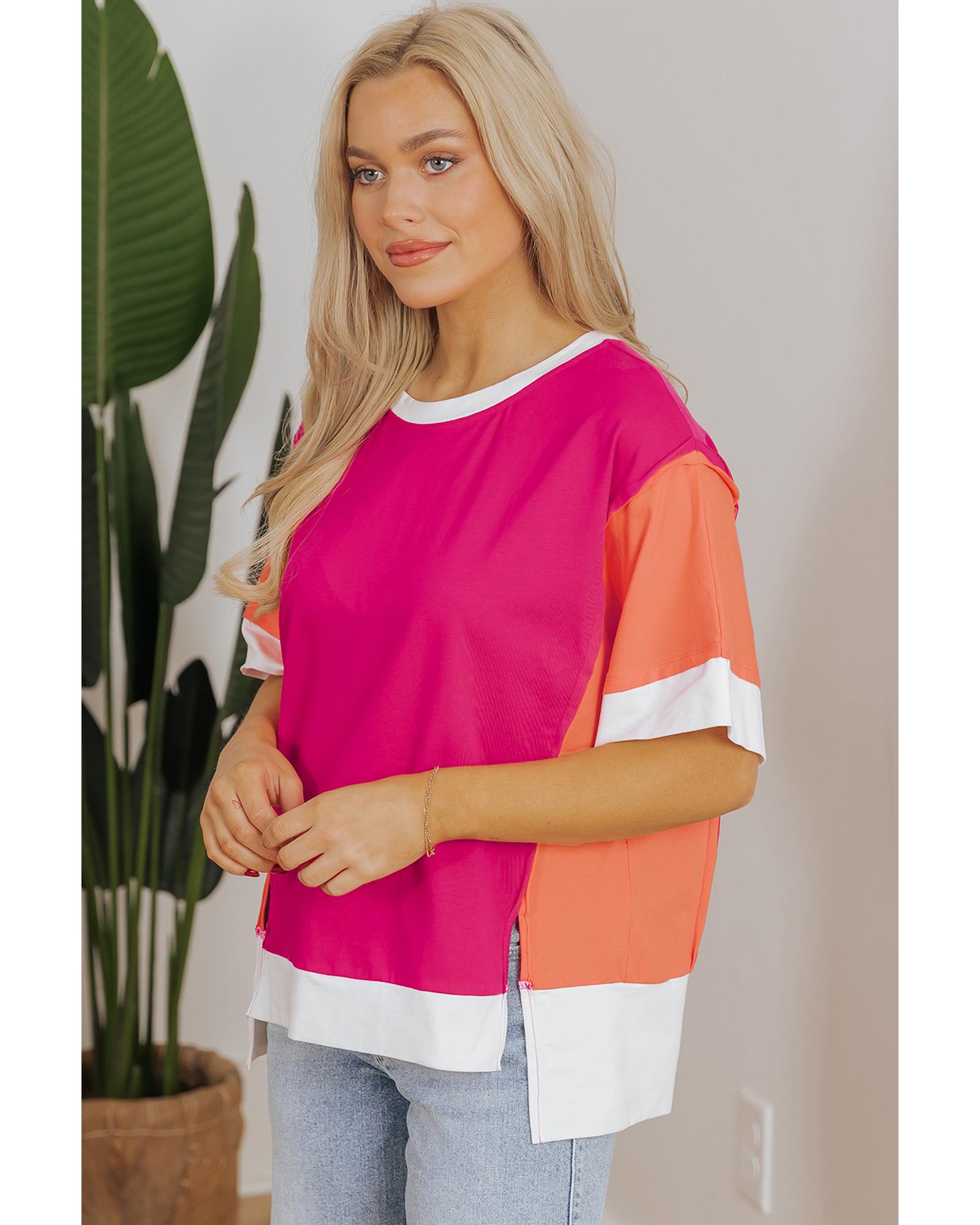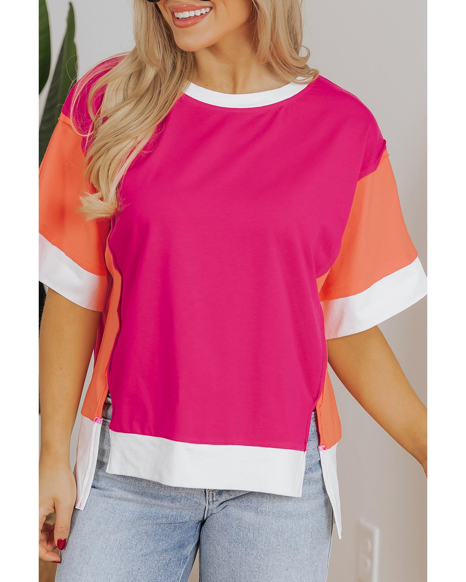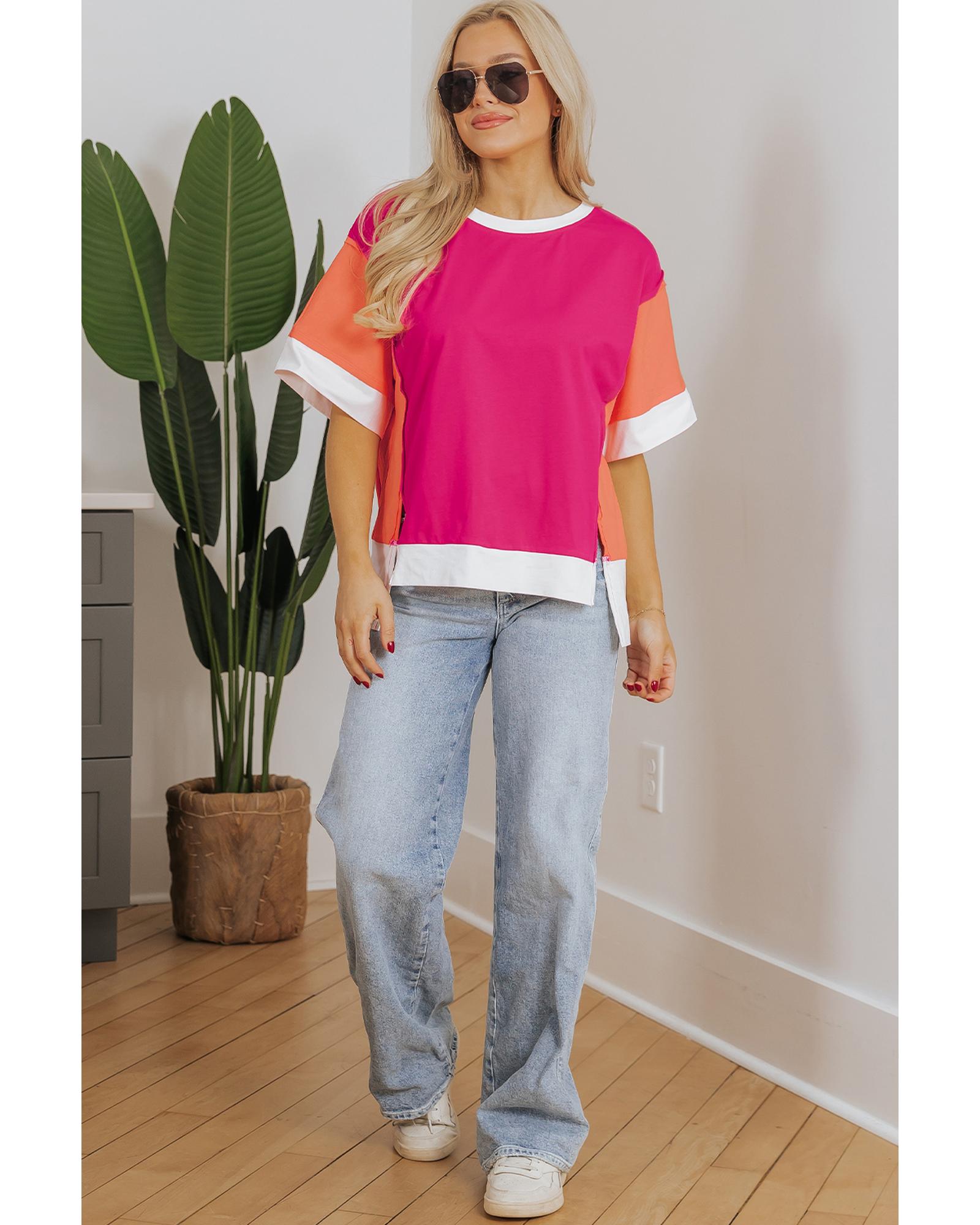 Rose Red Color Block Patchwork Side Slits Loose Fit T Shirt – XL