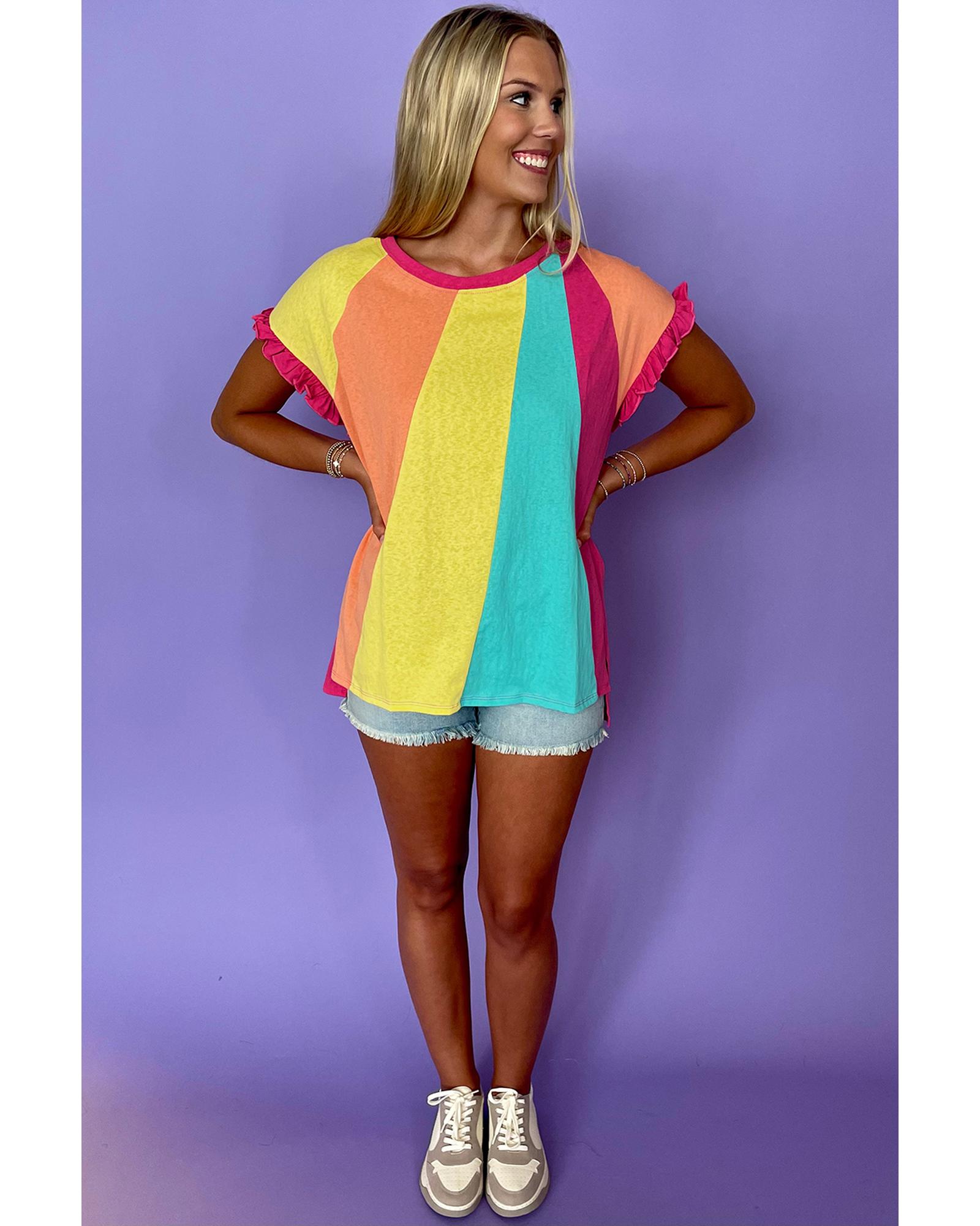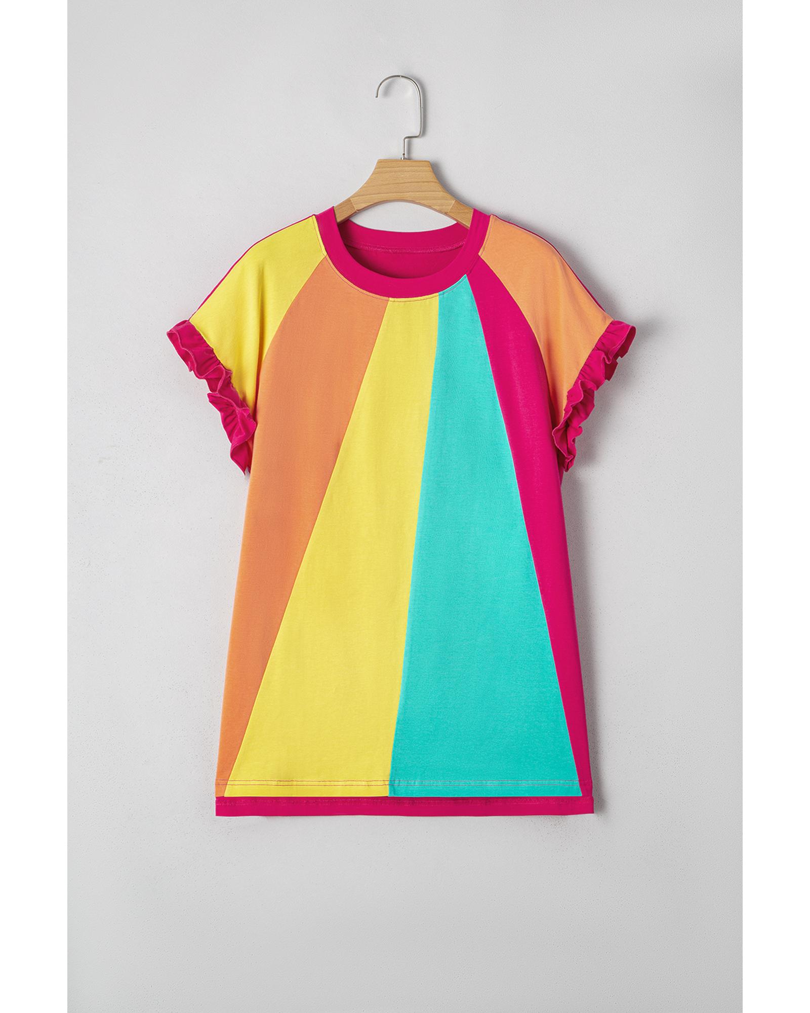 Rose Red Color Block Ruffled Crew Neck Loose Fit T Shirt – M