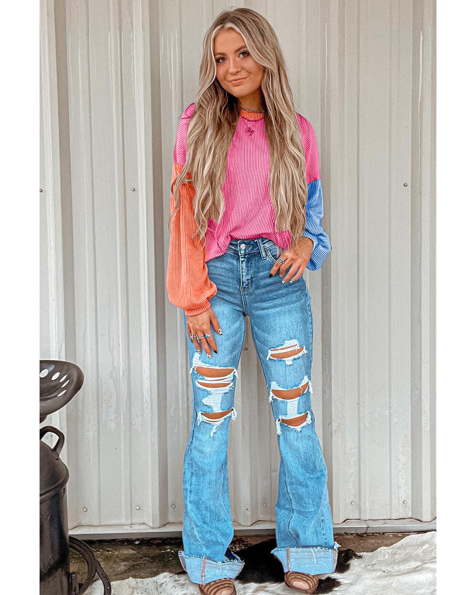 Rose Red Corded Colorblock Patchwork Drop Shoulder Long Sleeve Top – S