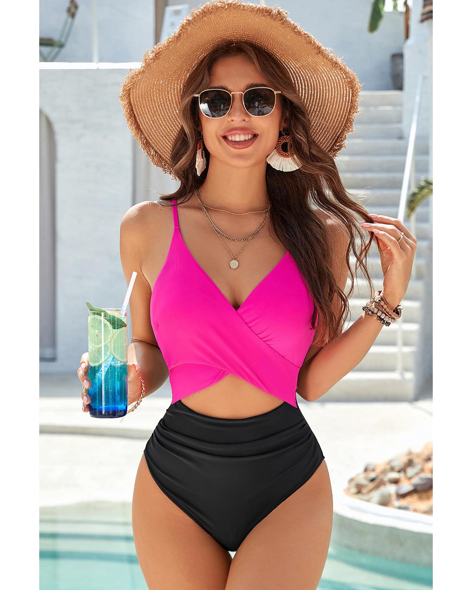 Rose Red Crossover Colorblock Cutout One Piece Swimsuit – 2XL