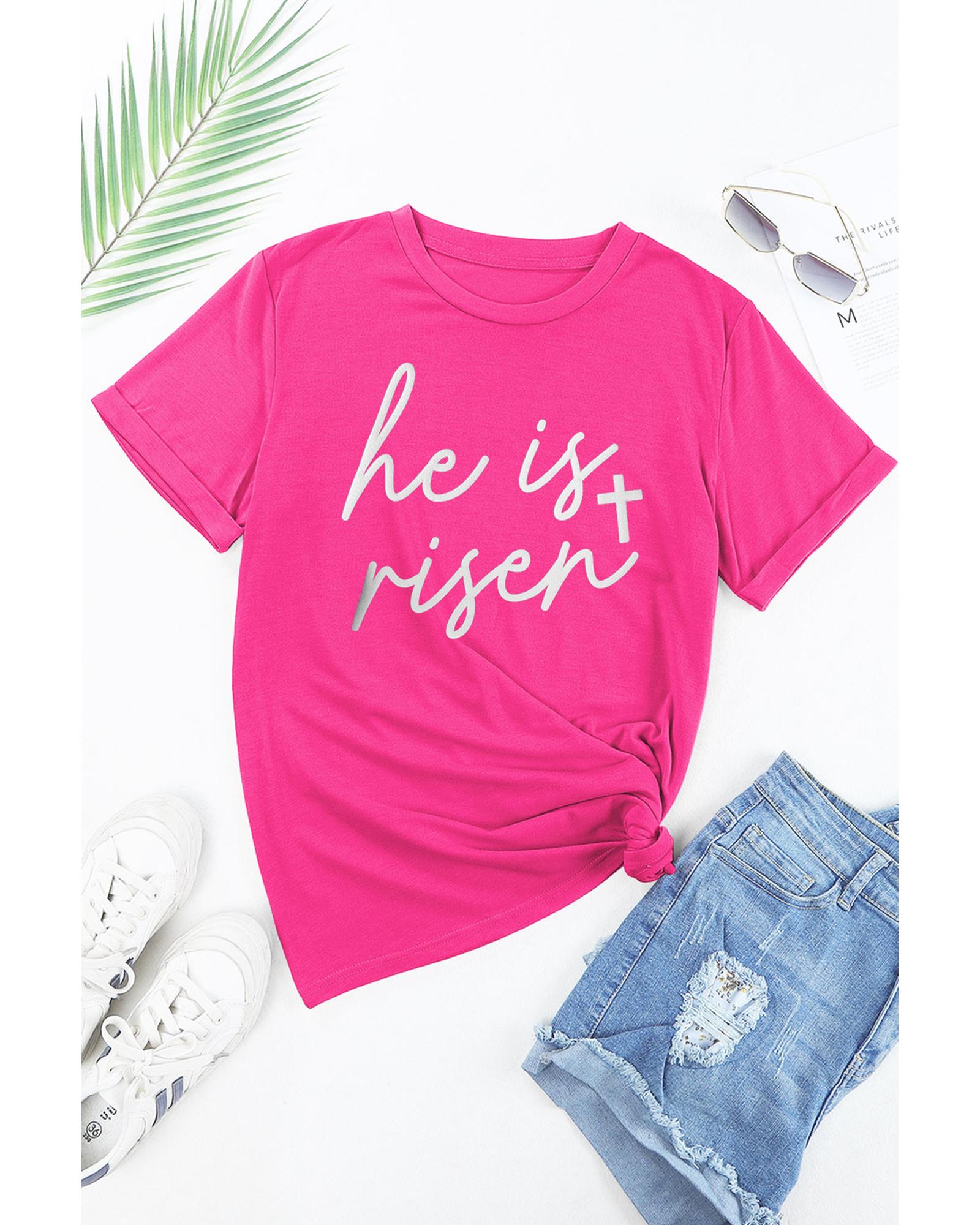 - Rose Red Glitter He is Risen Cross Printed Crewneck Tee