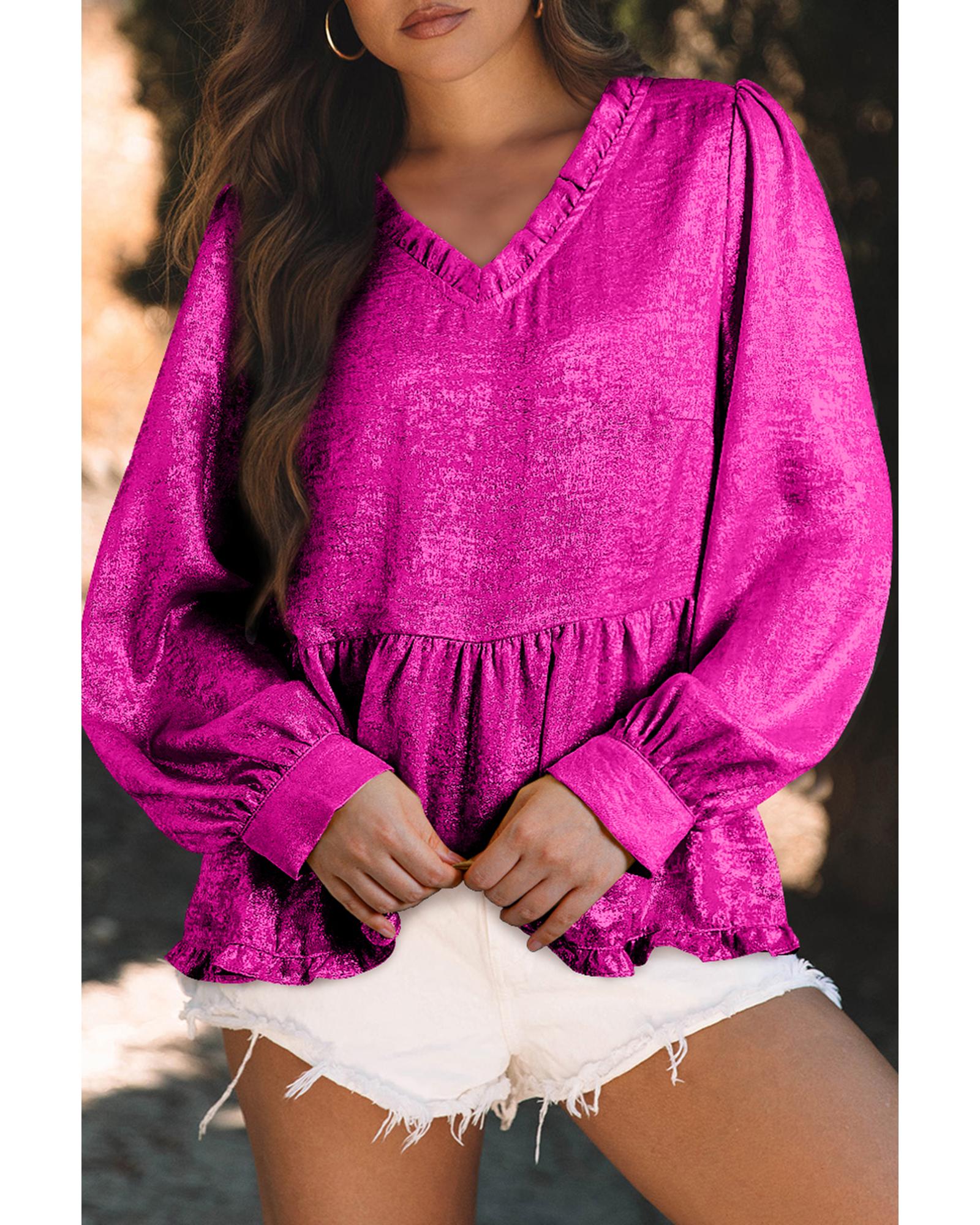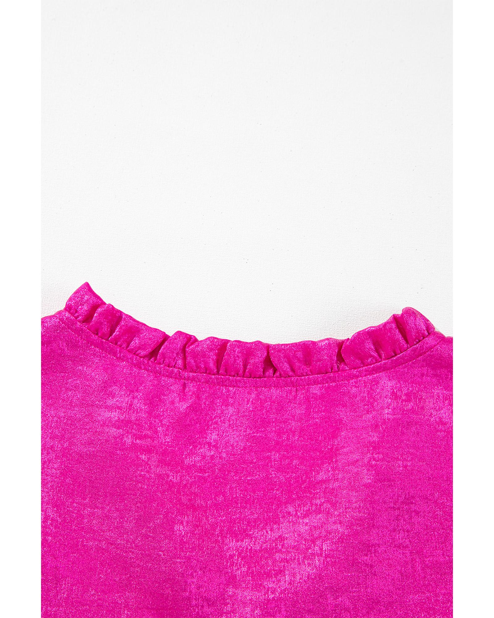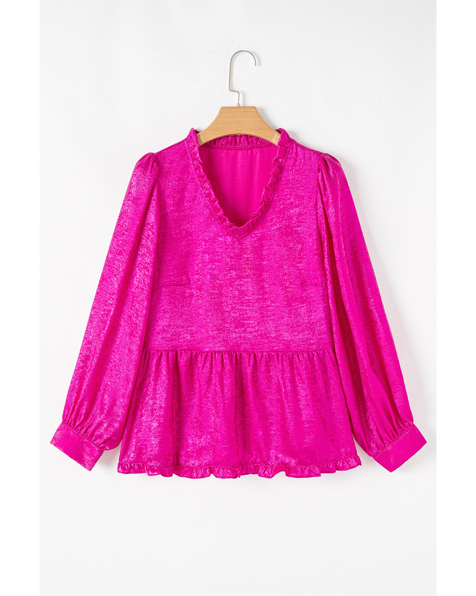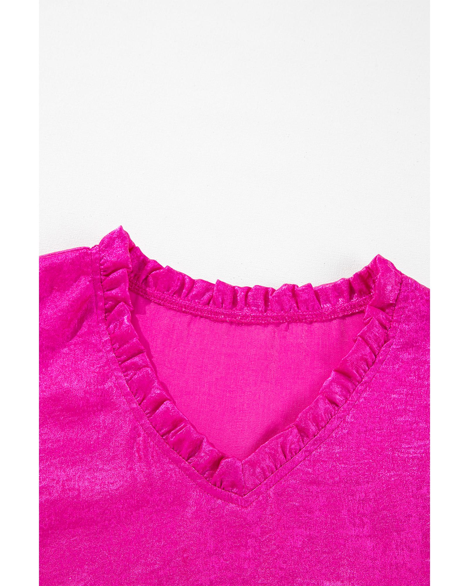 Rose Red Metallic Frilled V Neck Puff Sleeve Babydoll Blouse – XL