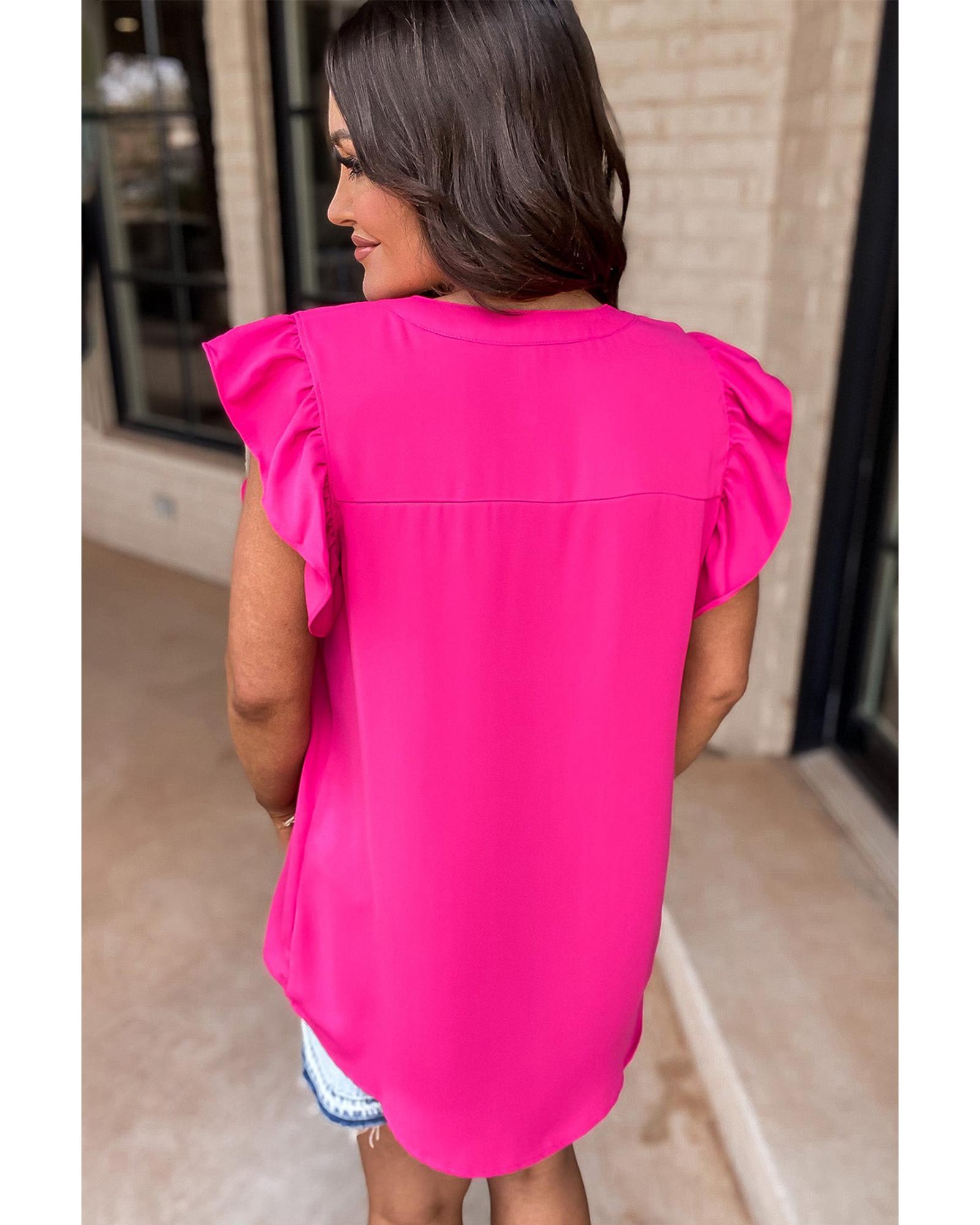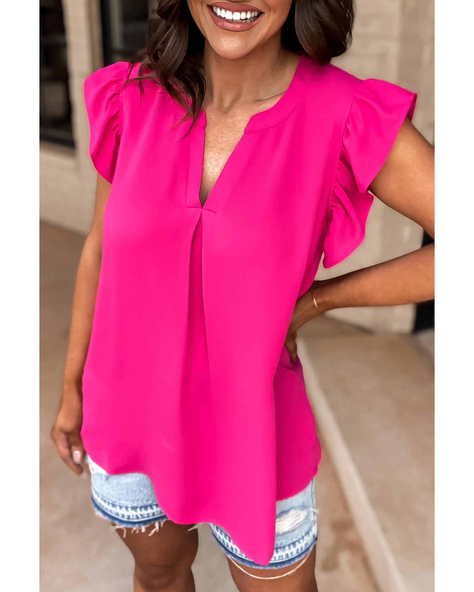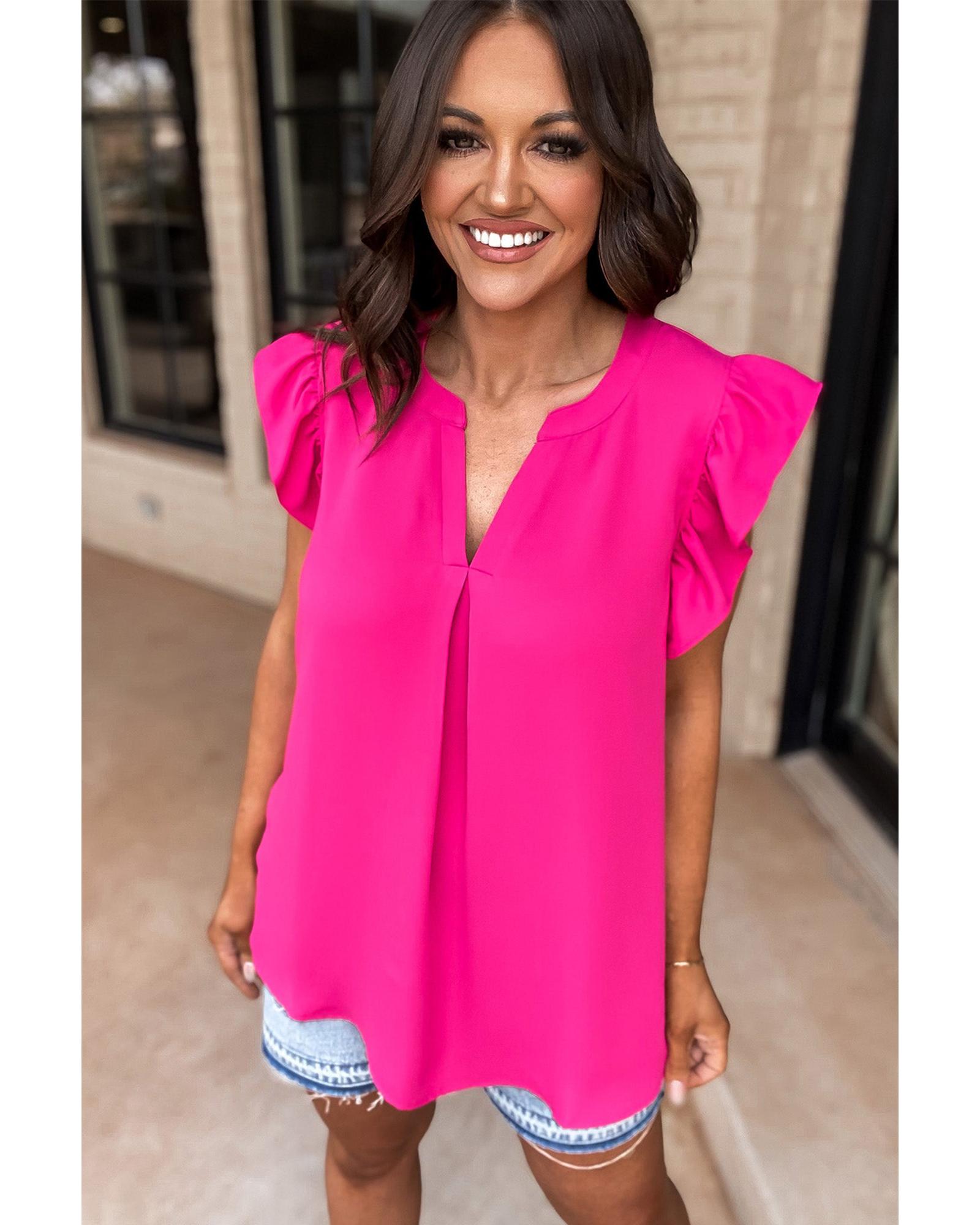 Rose Red Notched Neck Ruffle Sleeve Blouse – S