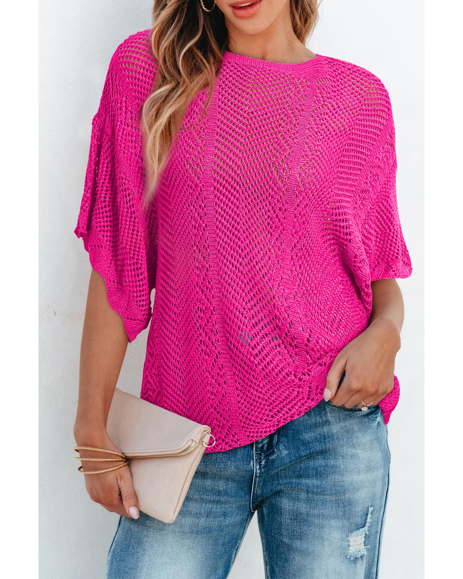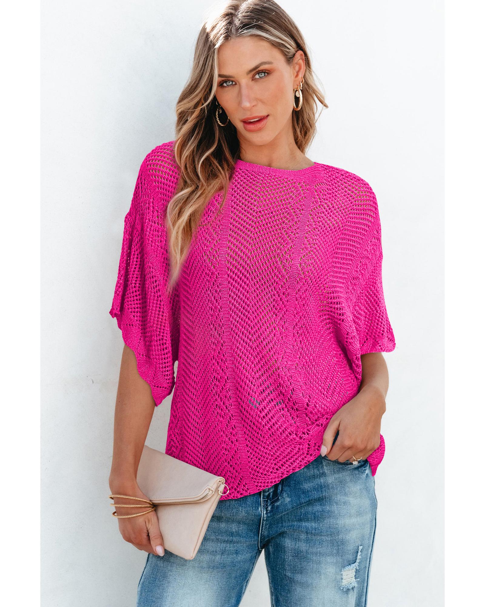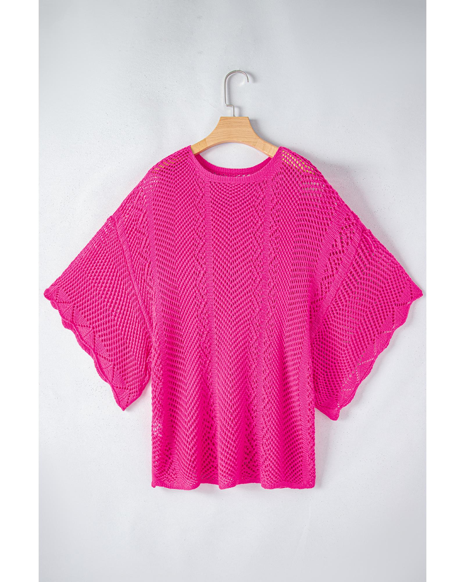 Rose Red Pointelle Knit Scallop Edge Short Sleeve Top – L