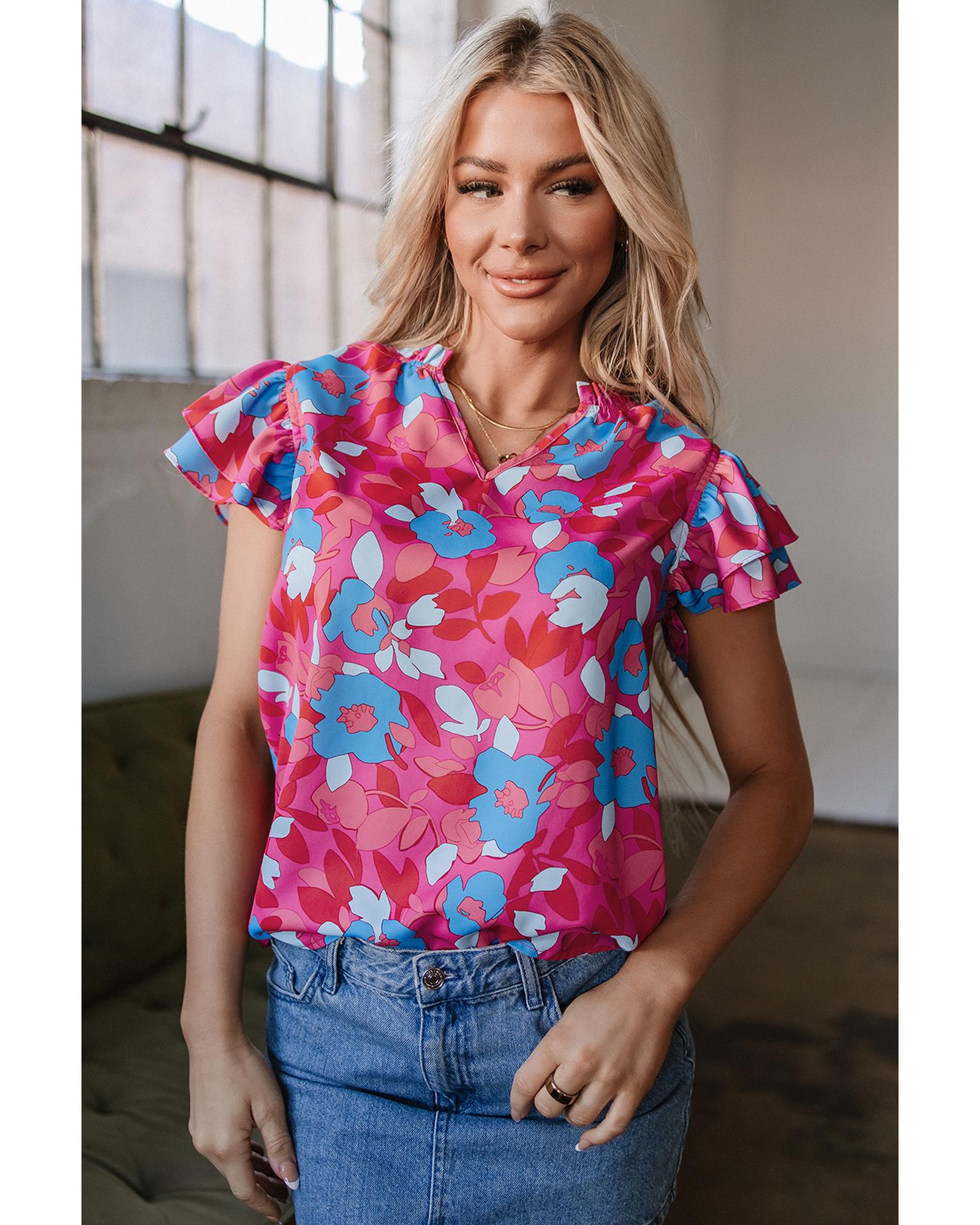 Rose Red Ruffled Sleeve Floral Blouse – XL