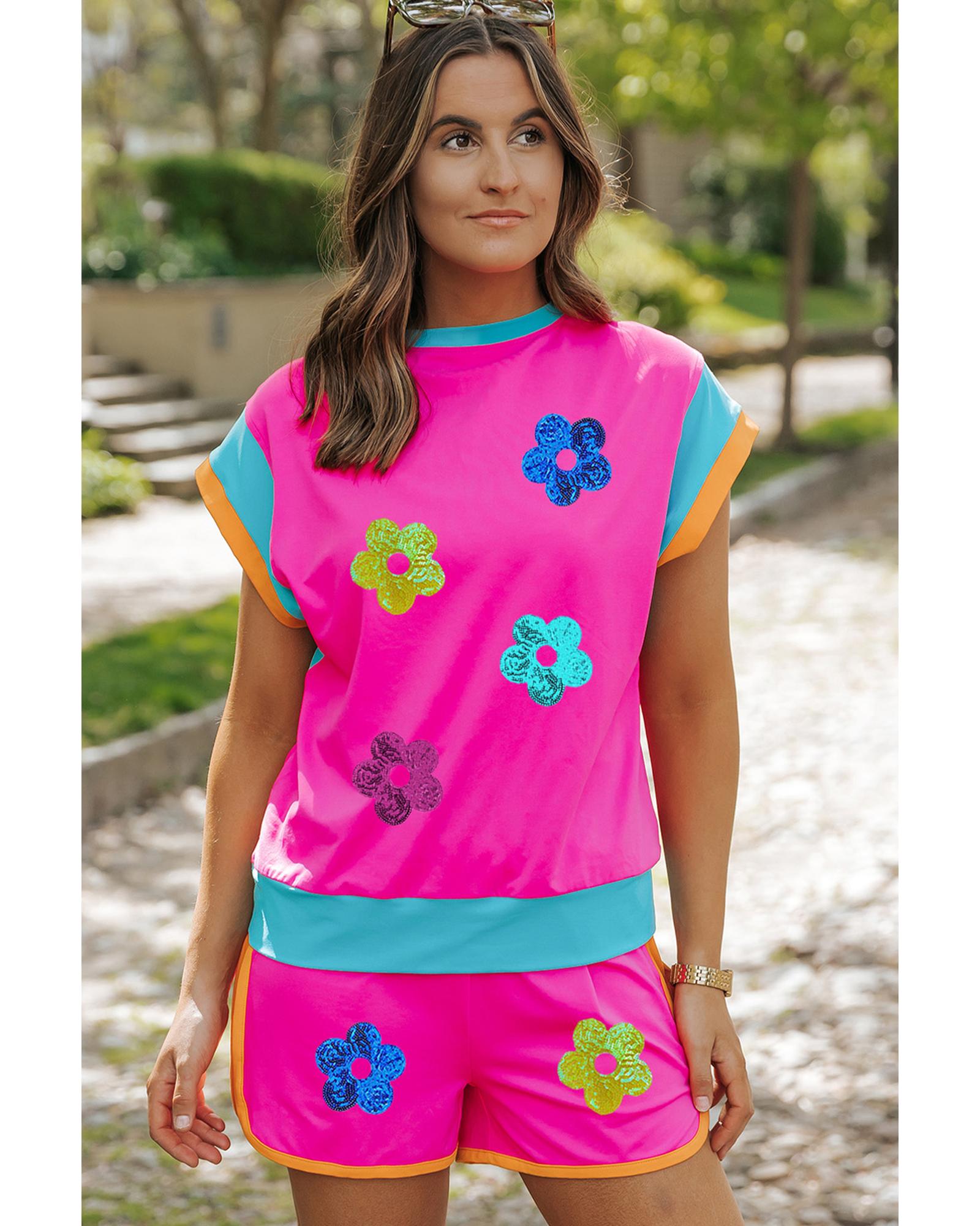Rose Red Sequined Flower Graphic Colorblock 2 Piece Shorts Set – L
