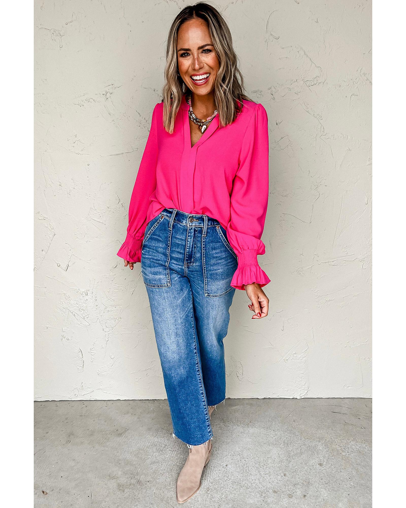 Rose Red Solid Color Shirred Cuff Notch V Neck Blouse – XL