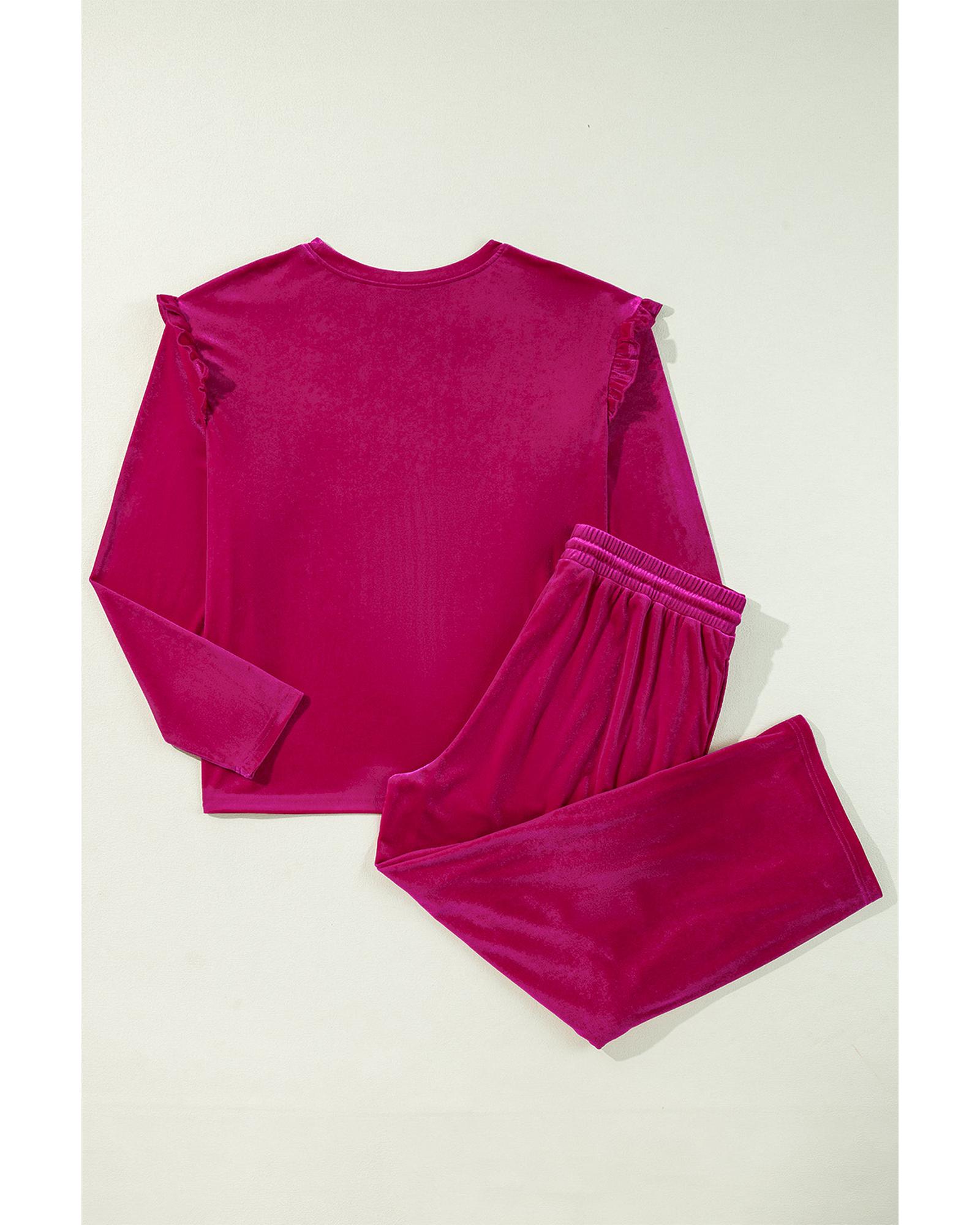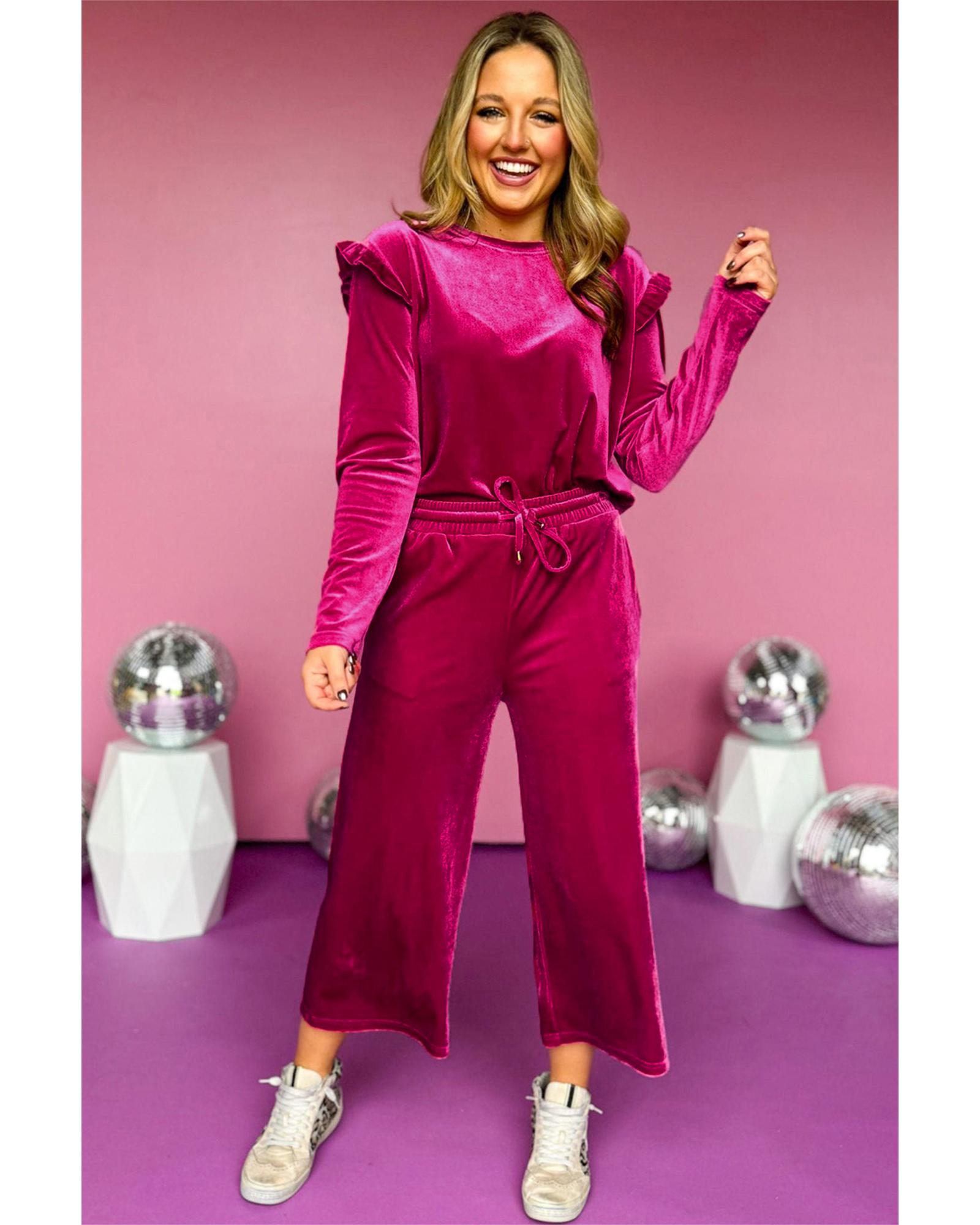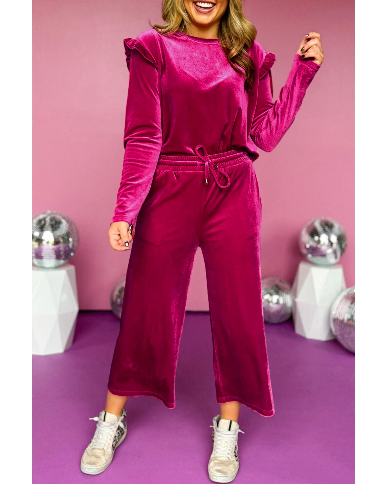 Rose Red Solid Velvet Ruffled Two Piece Pants Set – XL