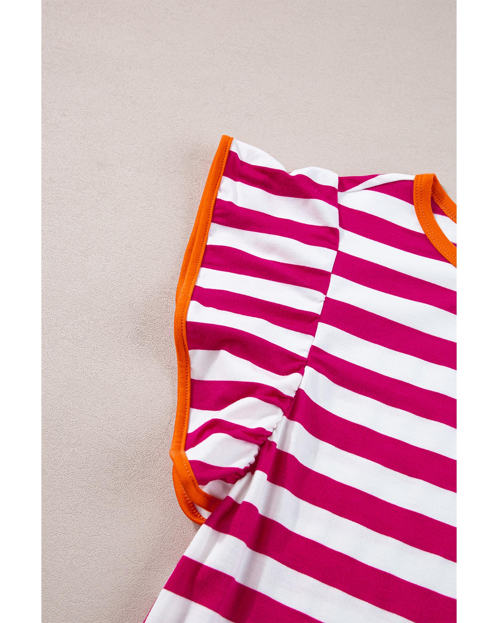 Rose Red Striped Ruffle Sleeve Crew Neck Blouse – M