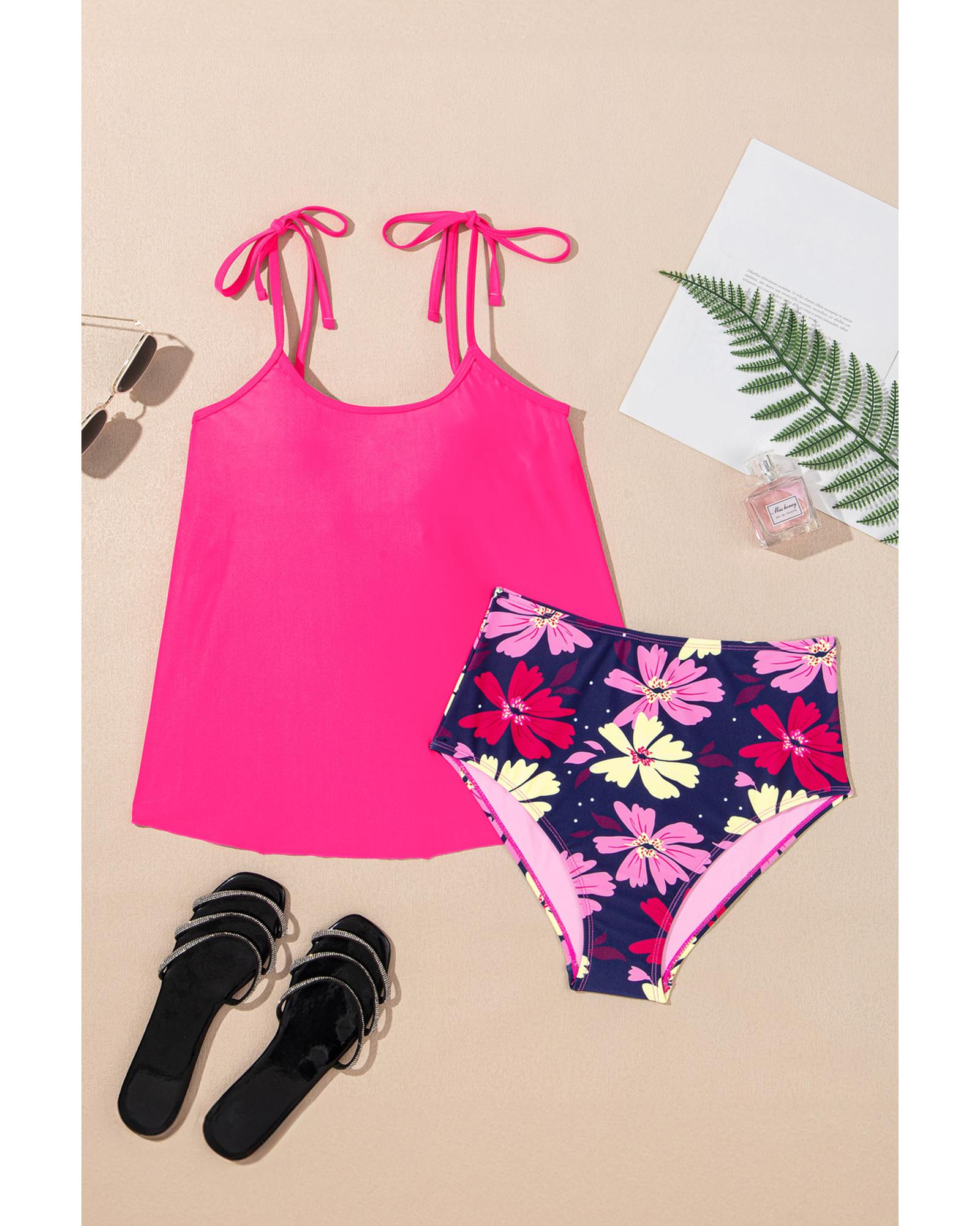 Rose Red Tie Shoulder Floral Print Cute Tankini Set – S