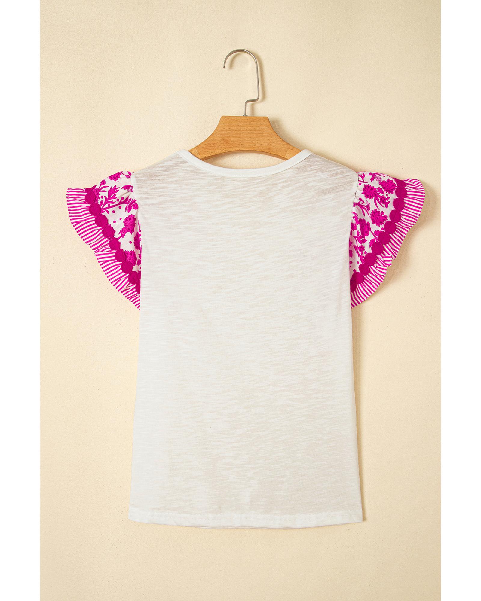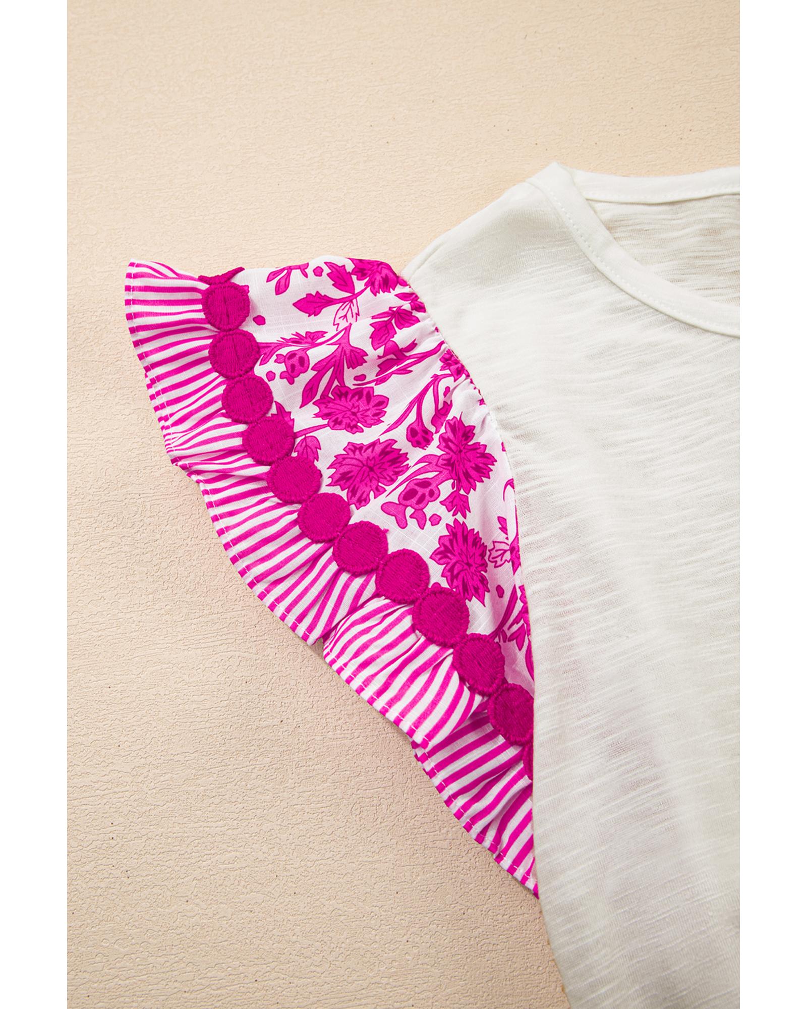 Rose Ricrac Trim Printed Flutter Sleeve Contrast Patchwork Blouse – S