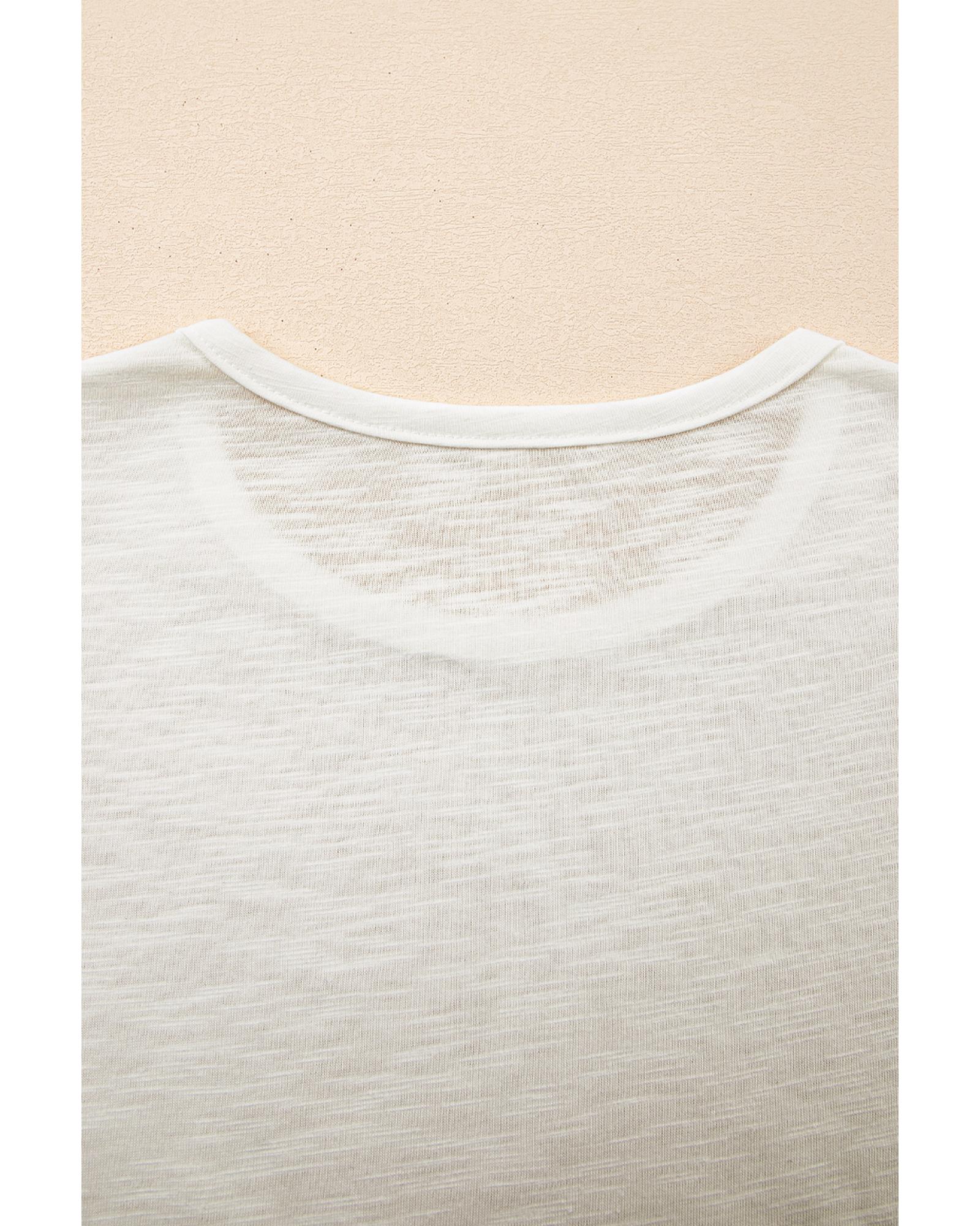 Beau Blue Eyelet Flower Embroidered Puff Short Sleeve Patchwork Crew Neck Blouse - XL