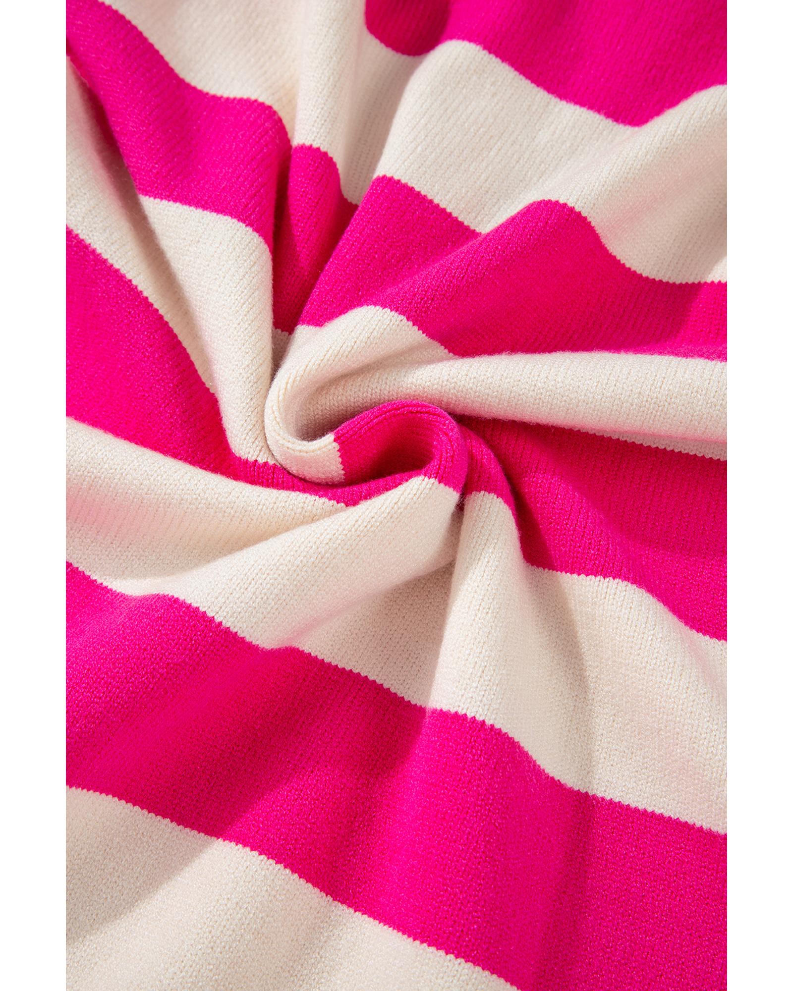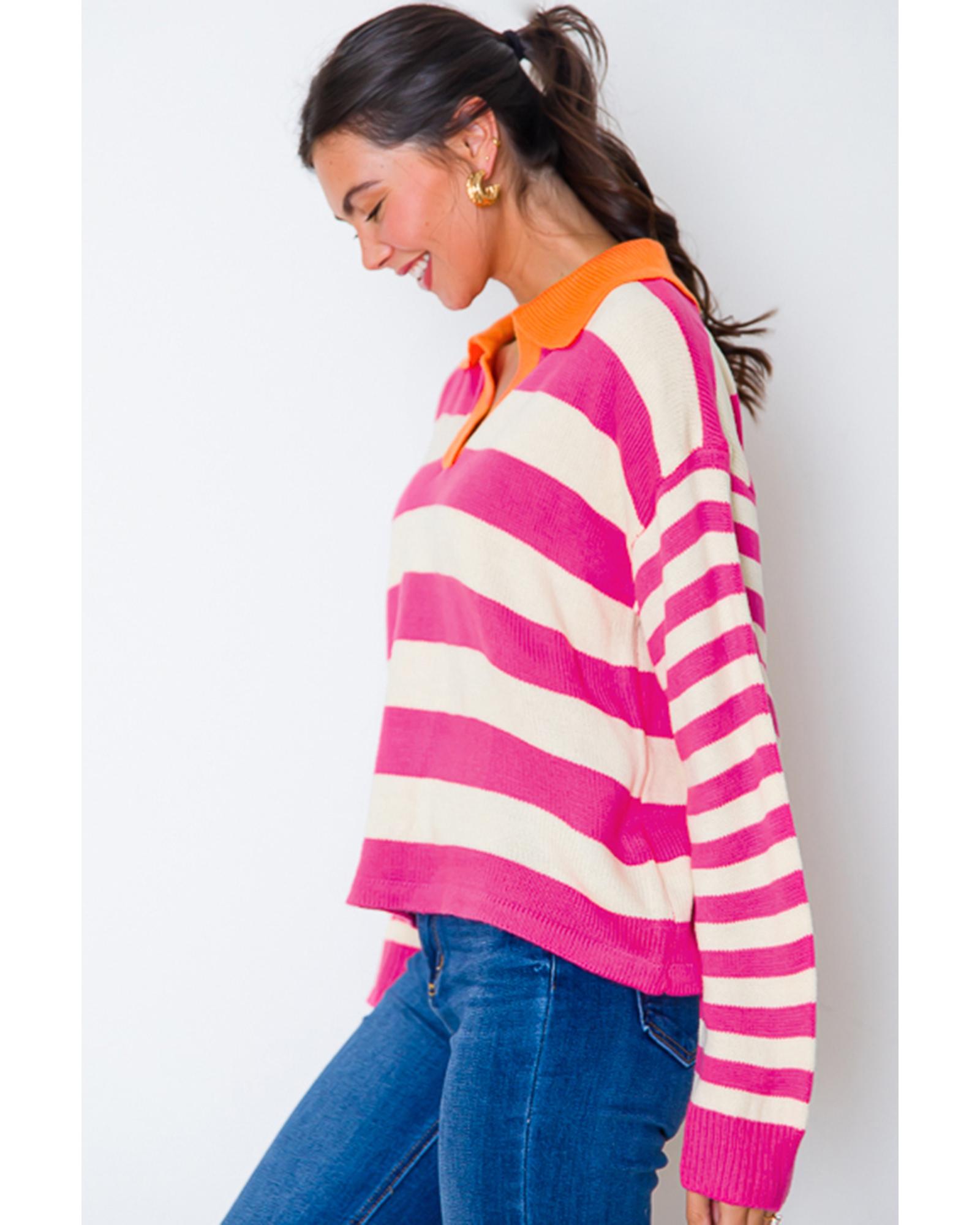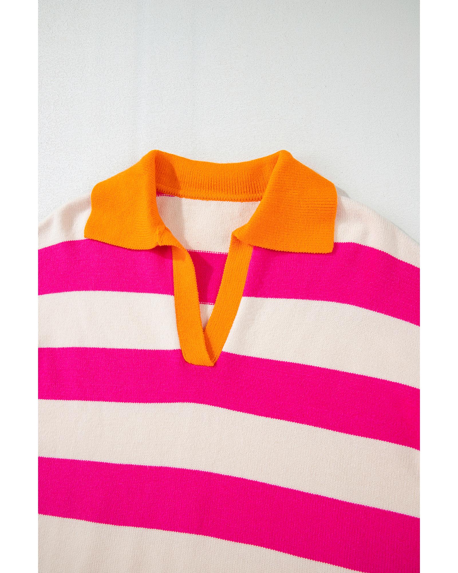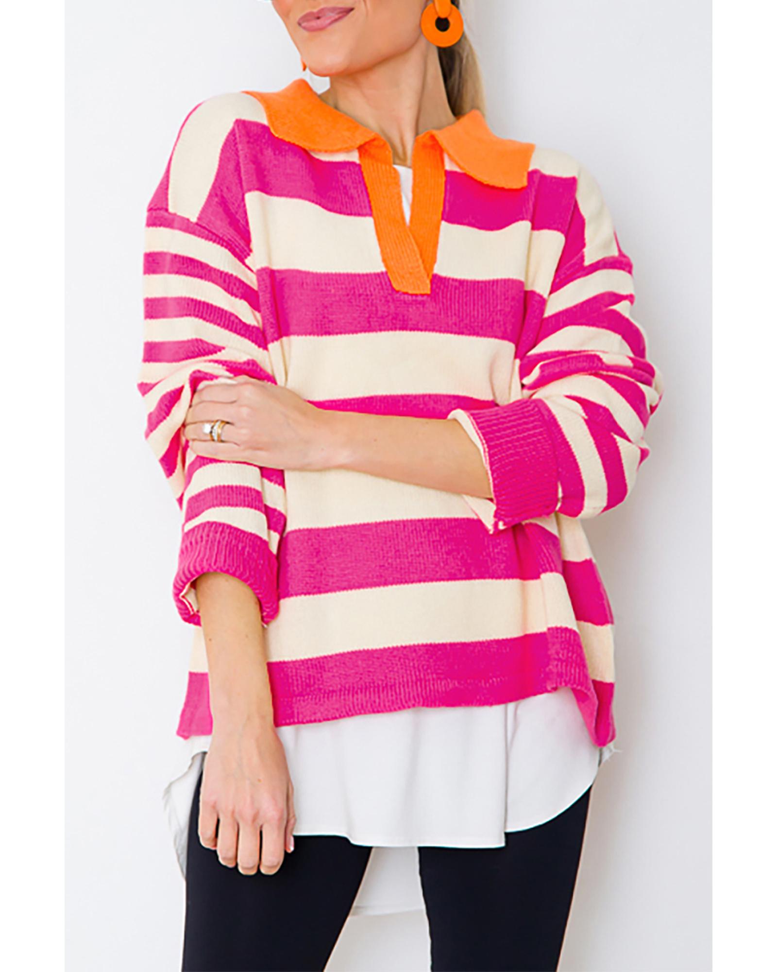 Rose Stripe Color Block Collared V Neck Drop Shoulder Sweater – M