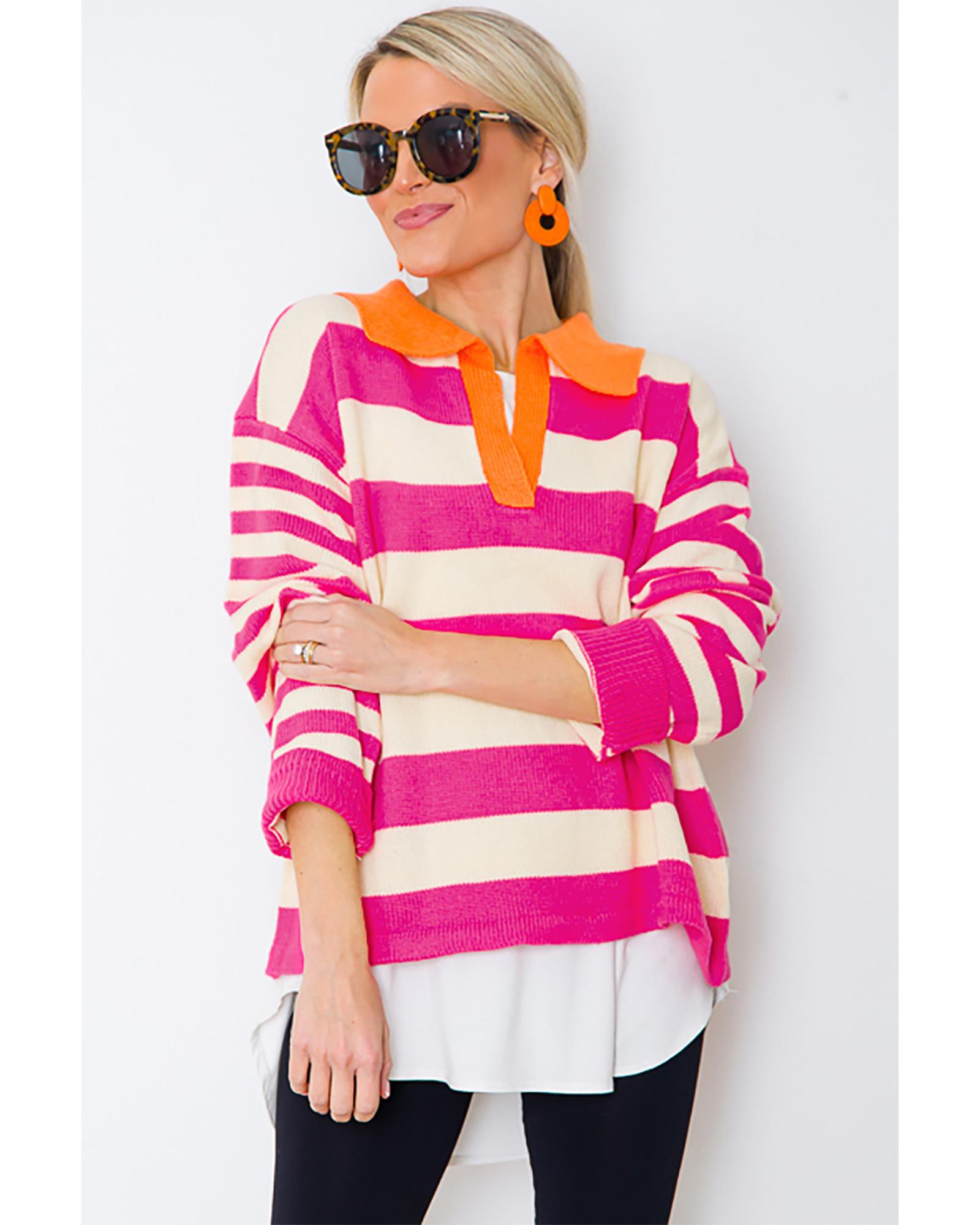 Rose Stripe Color Block Collared V Neck Drop Shoulder Sweater – XL