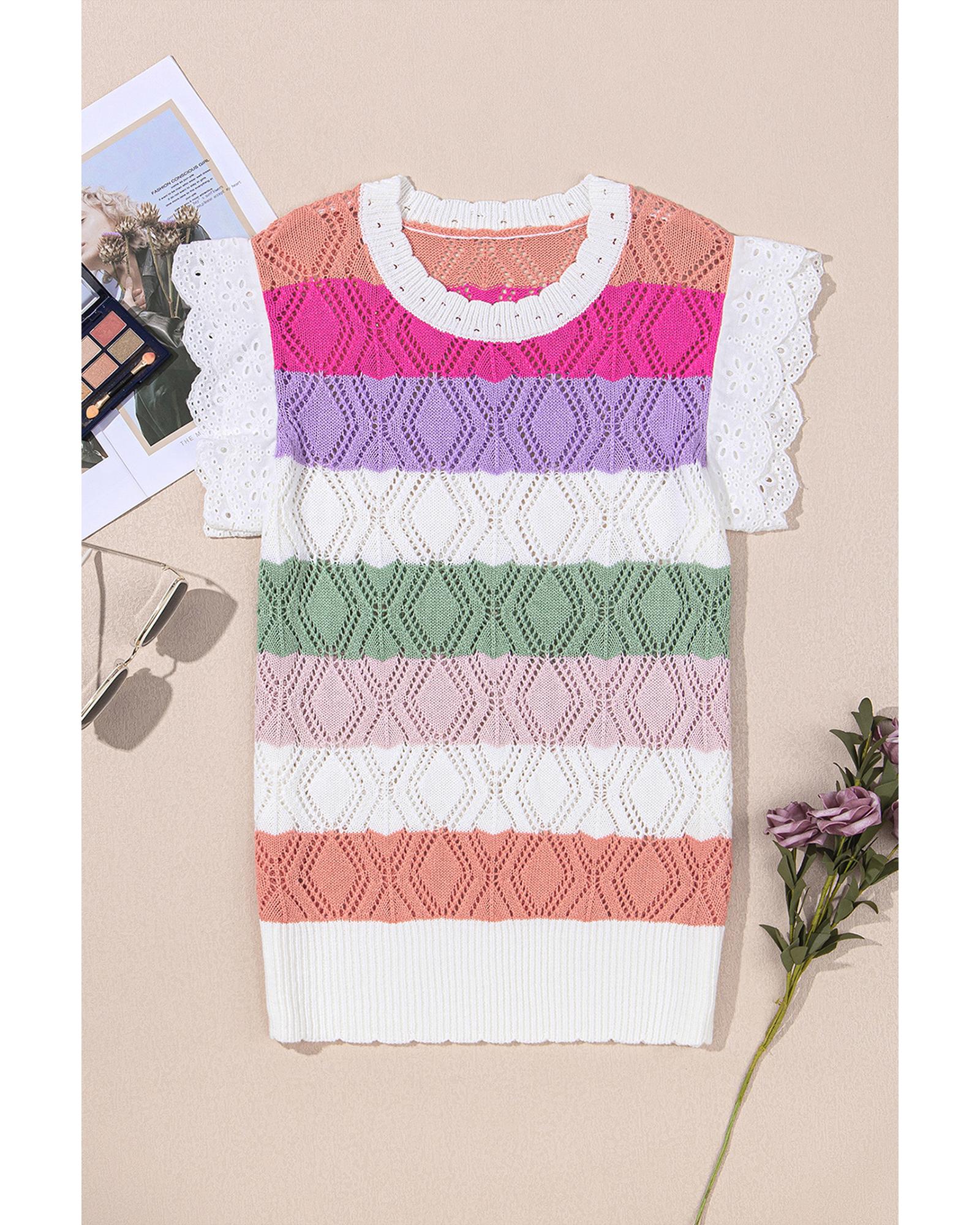 Rose Stripe Colorblock Hollowed Knit Scallop Edge Sweater Vest – L