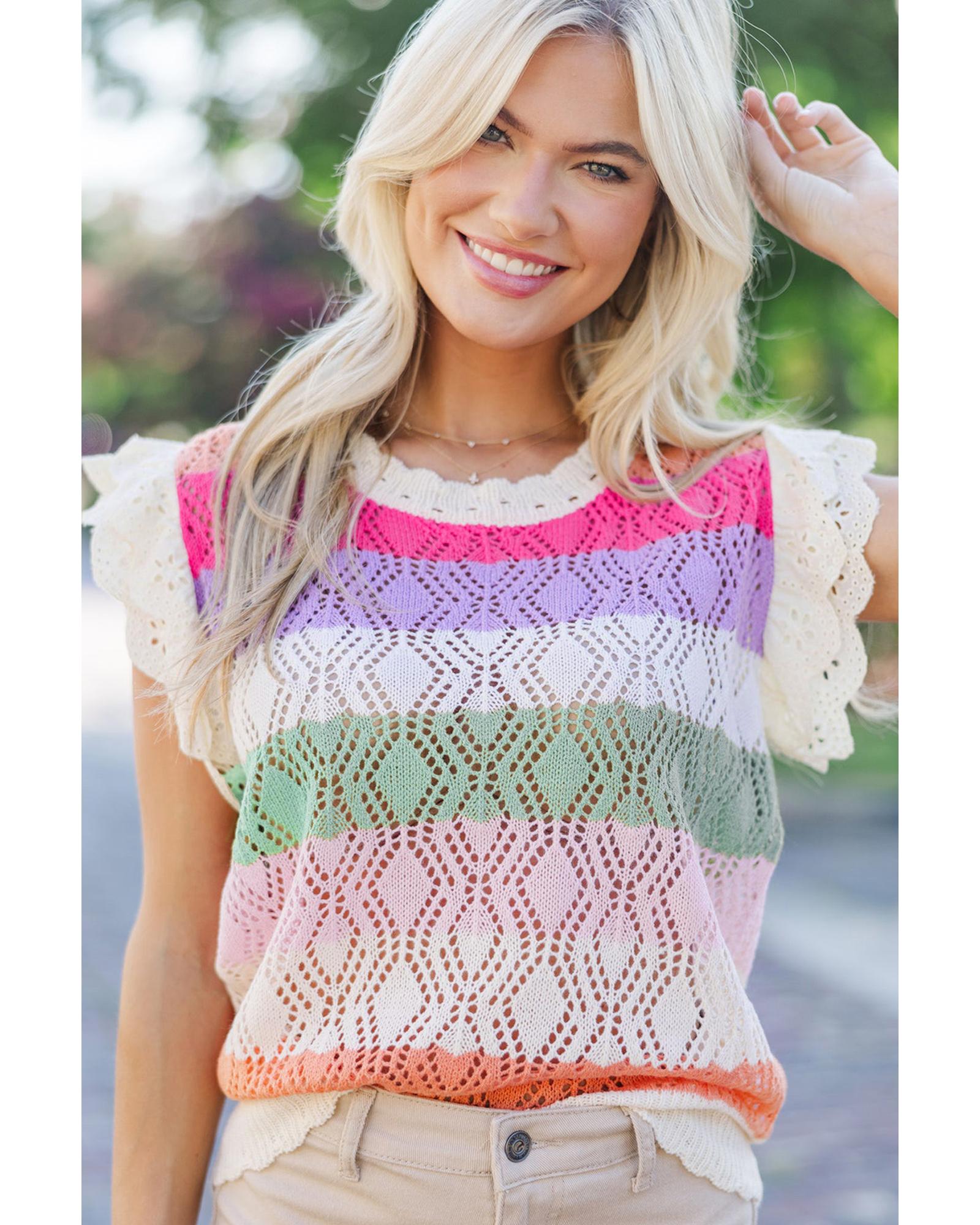 Rose Stripe Colorblock Hollowed Knit Scallop Edge Sweater Vest – S