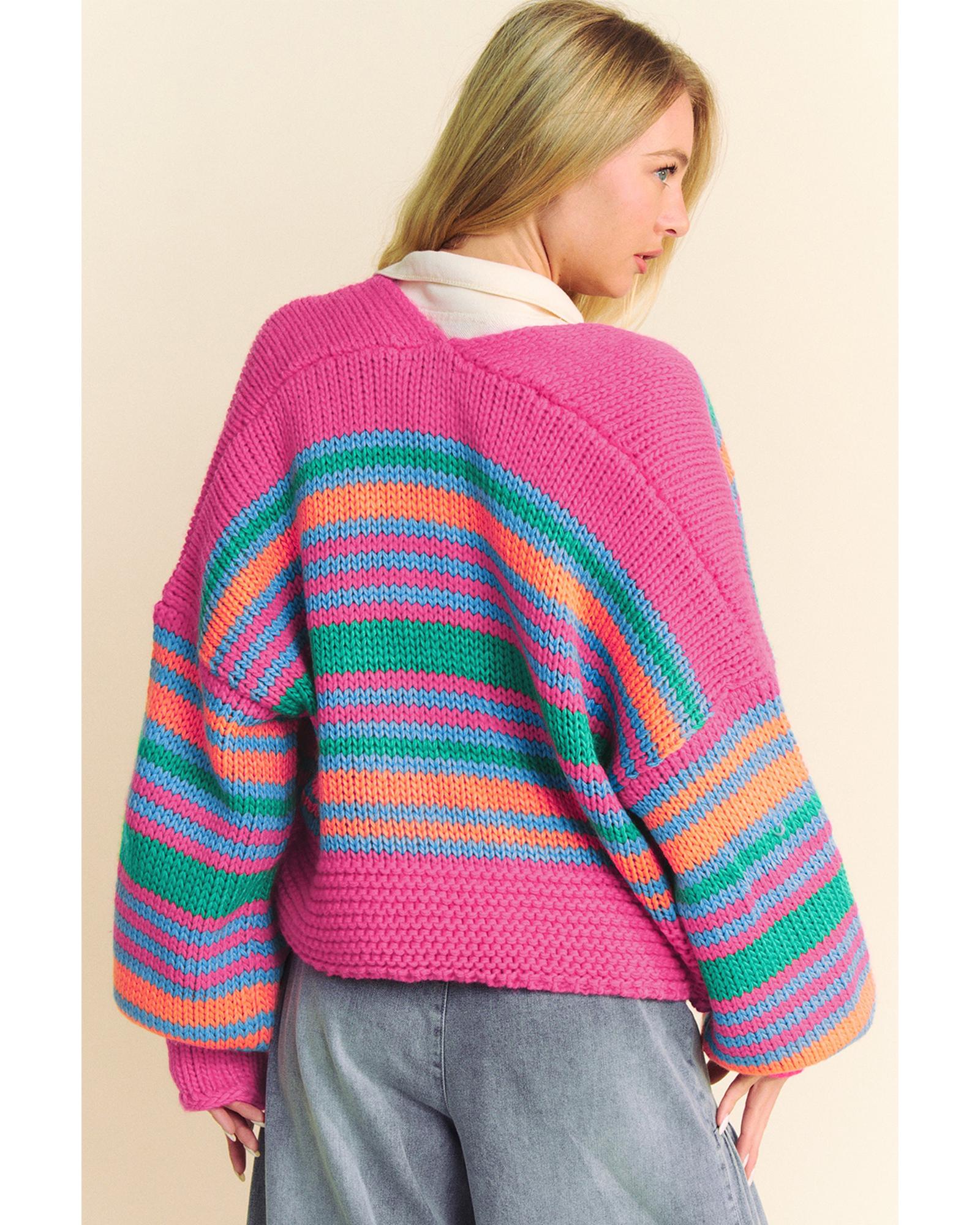 Rose Stripe Colorful Puff Sleeve Drop Shoulder Loose Cardigan – L