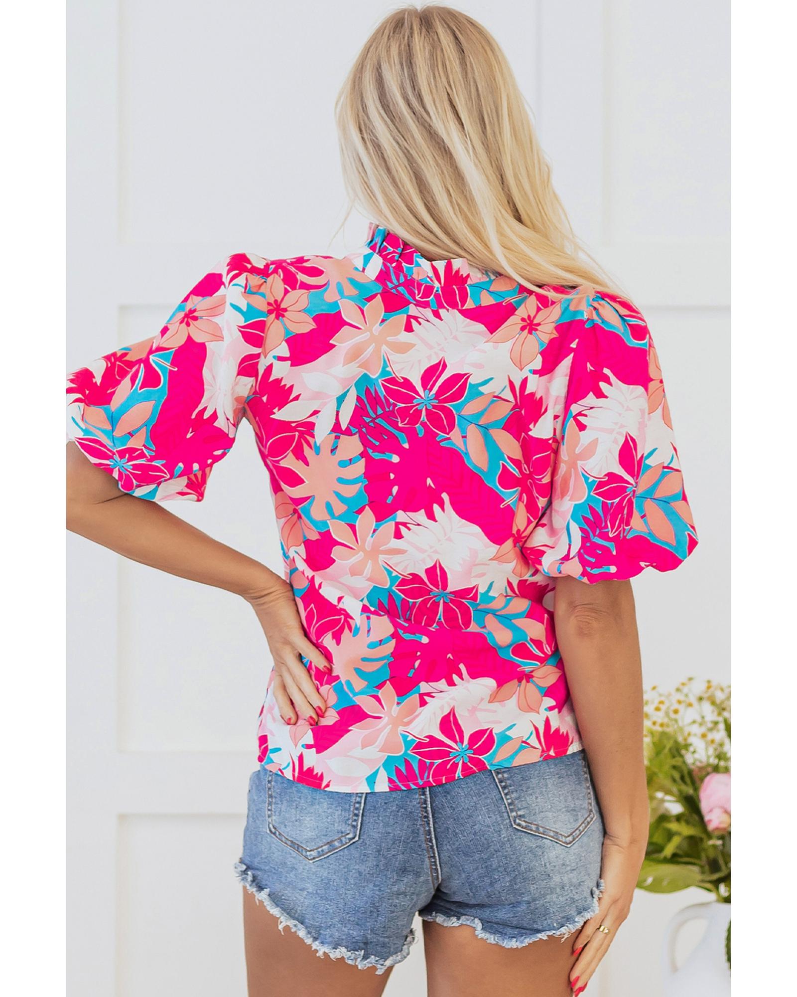 Rose Tropical Plant Printed V Neck Puff Sleeve Blouse – XL