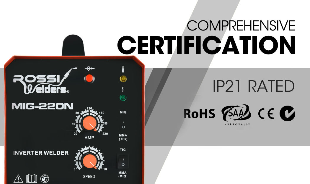 The new ROSSI MIG-220N Gas/Gasless Inverter Welder is capable of welding or joining just about anything. The MIG-220N handles MIG/TIG and MMA/ARC/Stick producing smooth accurate work – the MIG-220N is the master of metals!