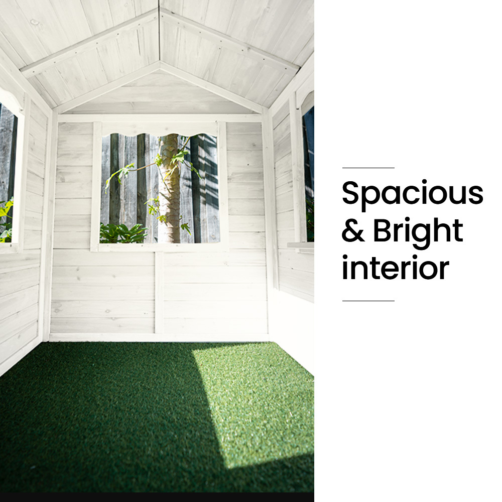 Manufactured with large windows allowing for plenty of natural light to filter in and an easily accessible front door, you will have a complete view of your childs imaginative cubby house play. Feel at ease knowing Rovo Kids provide round corners around the window sills for added protection during playtime and the cubby house construction is glass-free with non-toxic paint. The weather-resilient roof provides shade during the hot summer days and shelter in the winter.