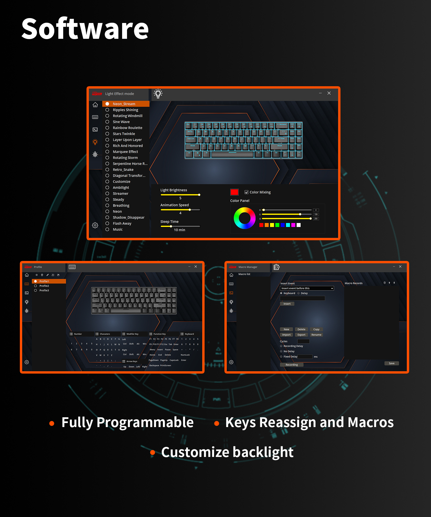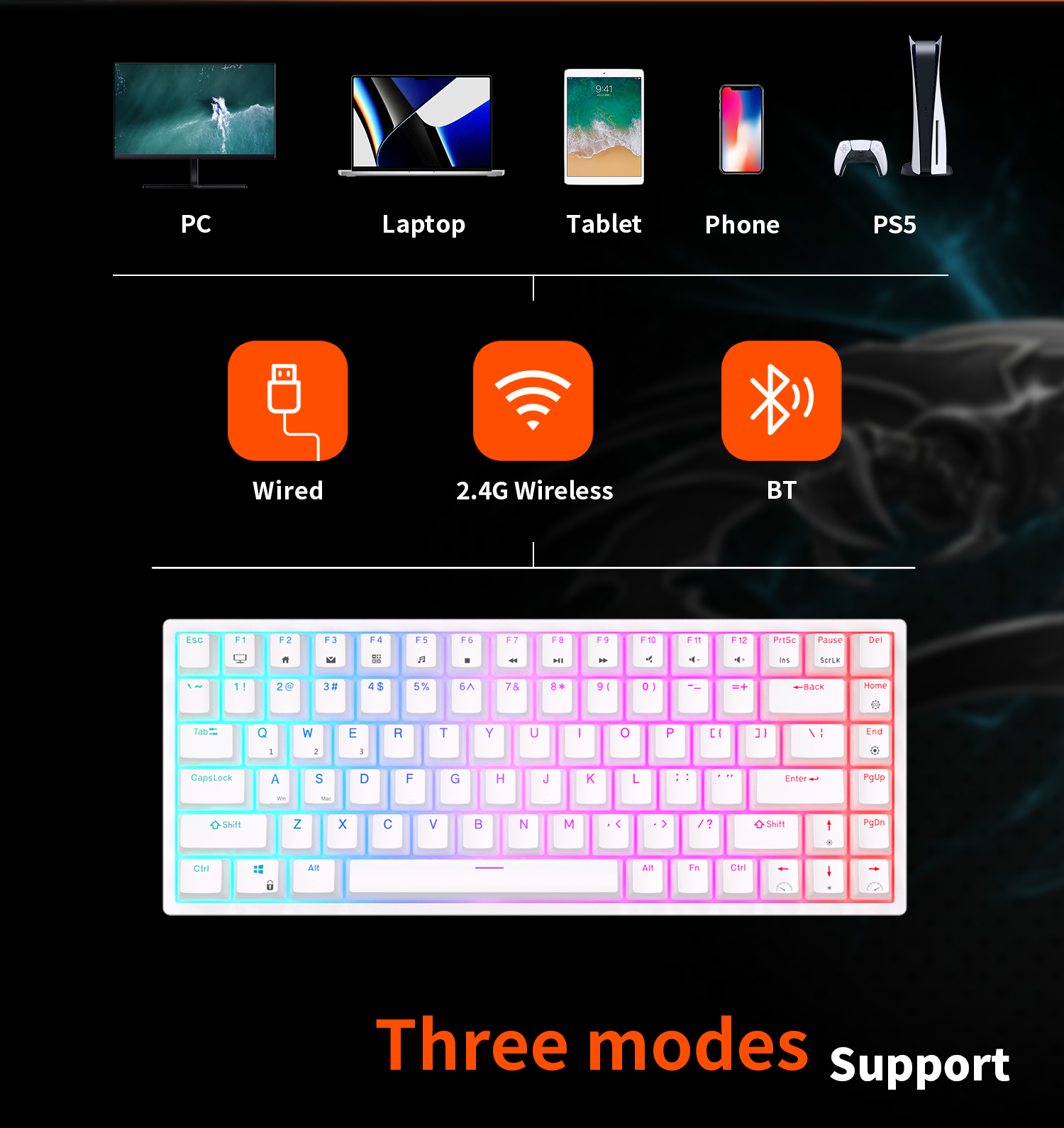 - That is THREE MODES: Believe it or not, this is the first generation of RGB three-mode wireless keyboards on the market. Wireless mode with stable bluetooth 5.0, hassle-free 2.4Ghz dongle plus USB-C wired mode set no limits about your keyboard connection.
