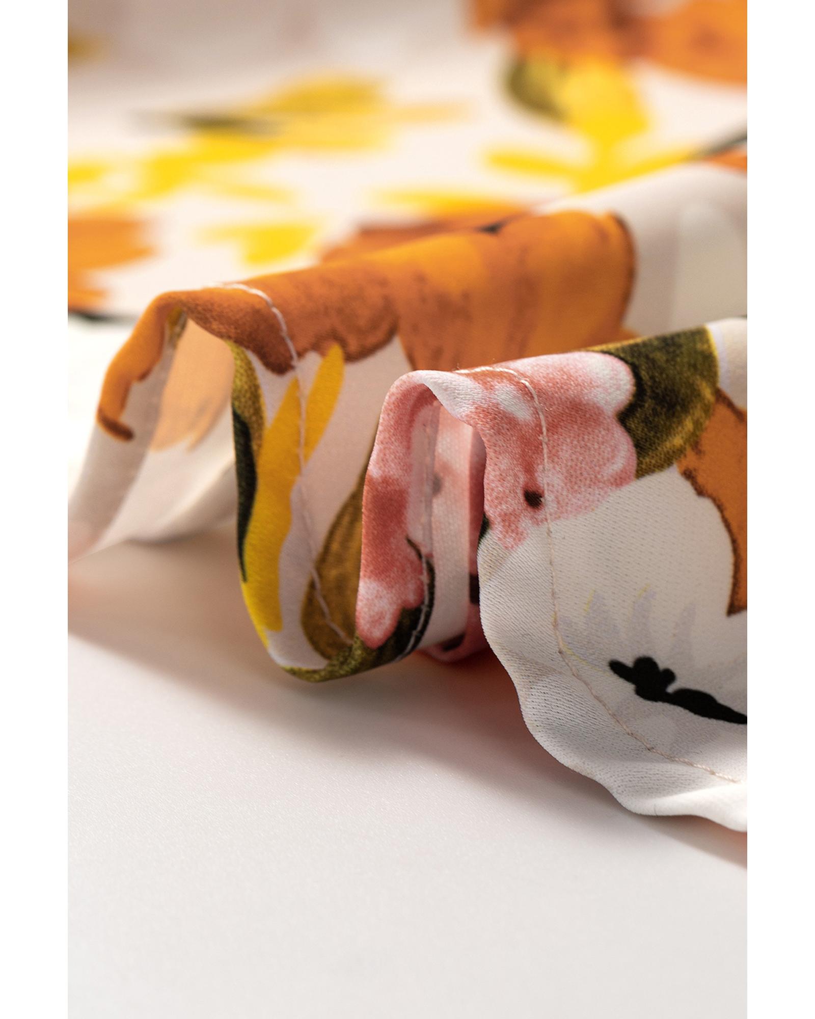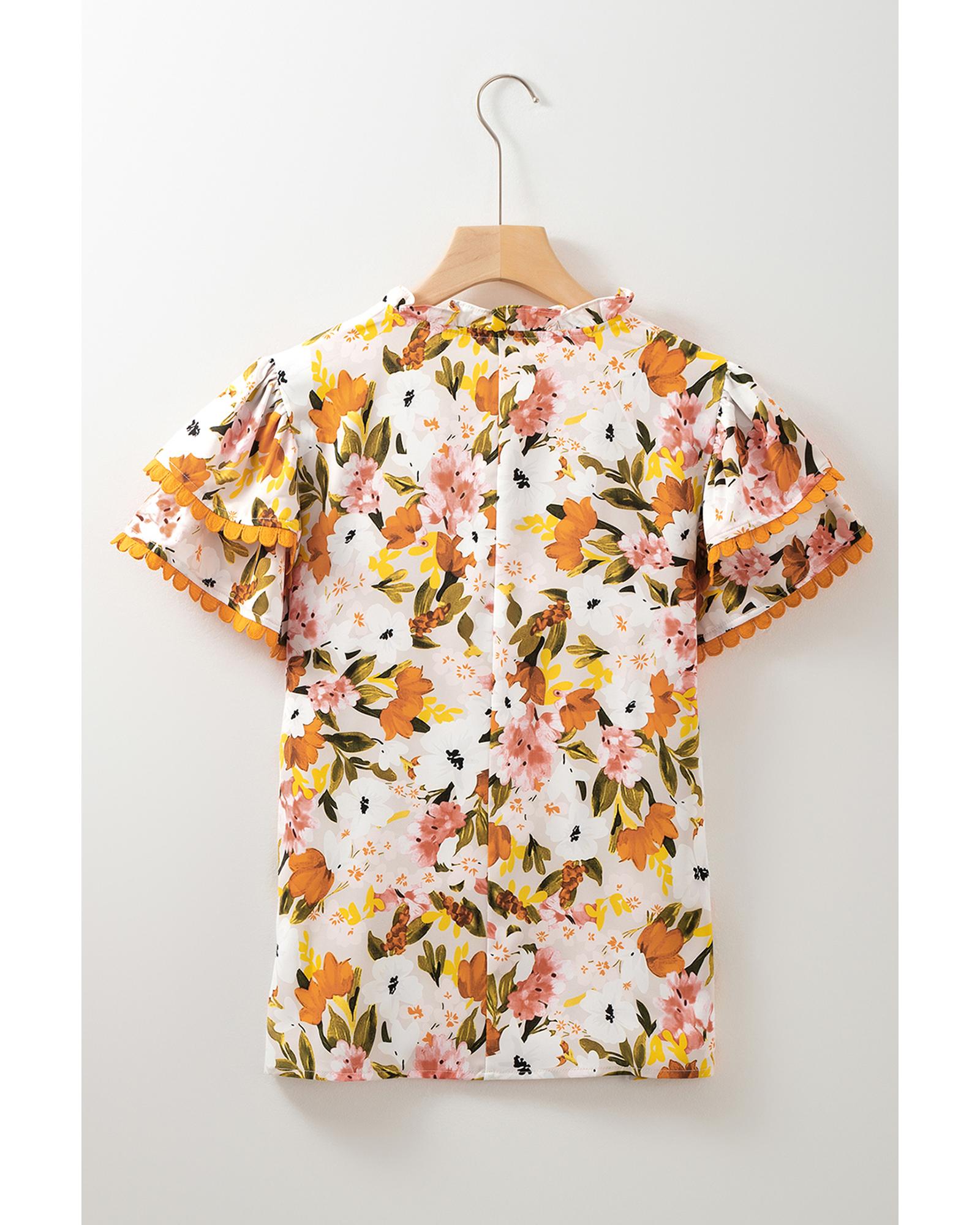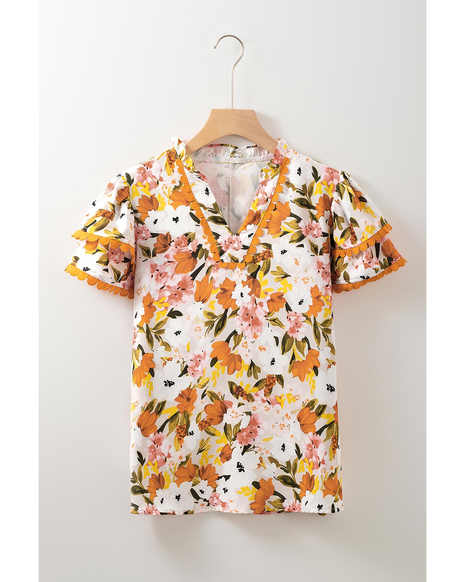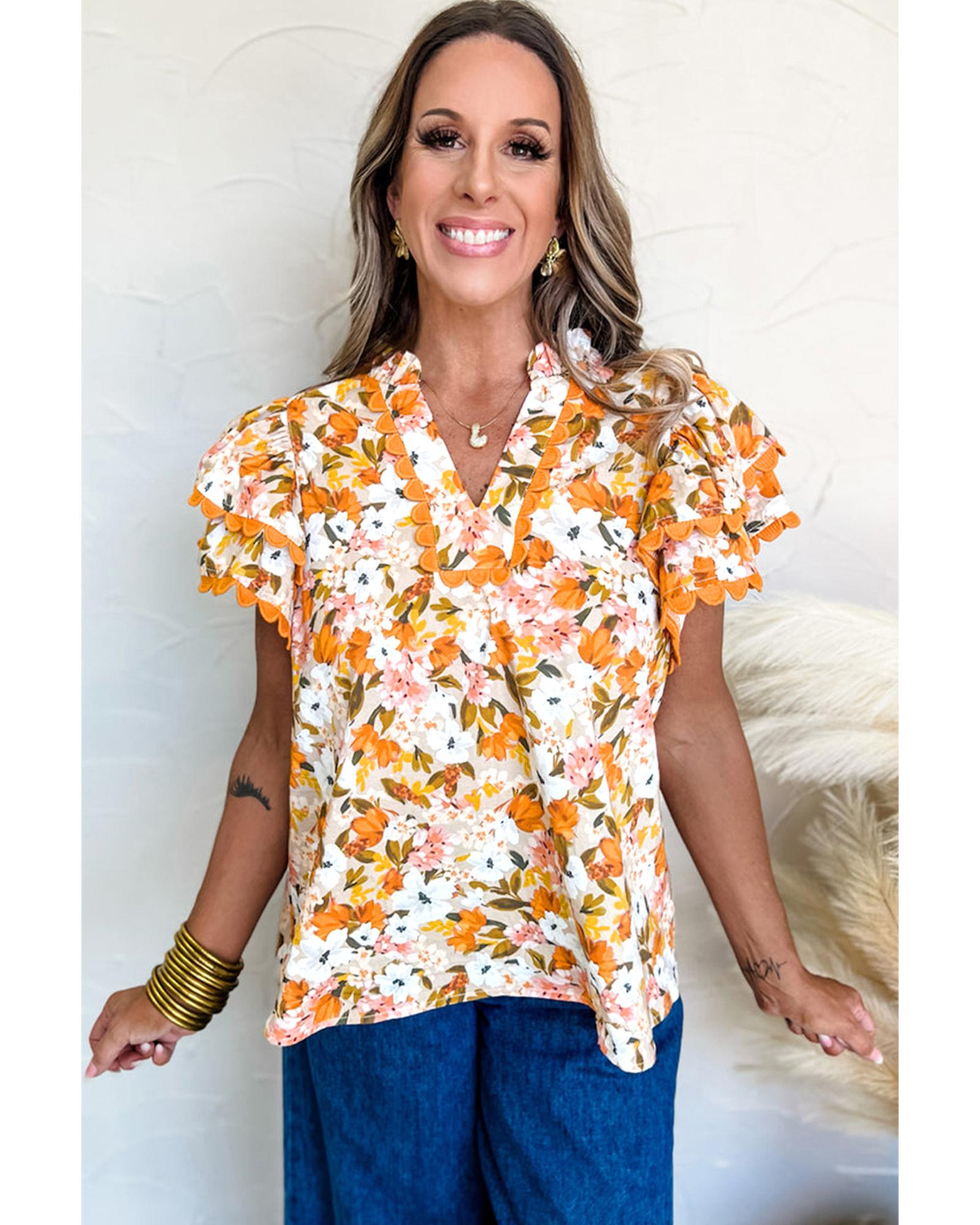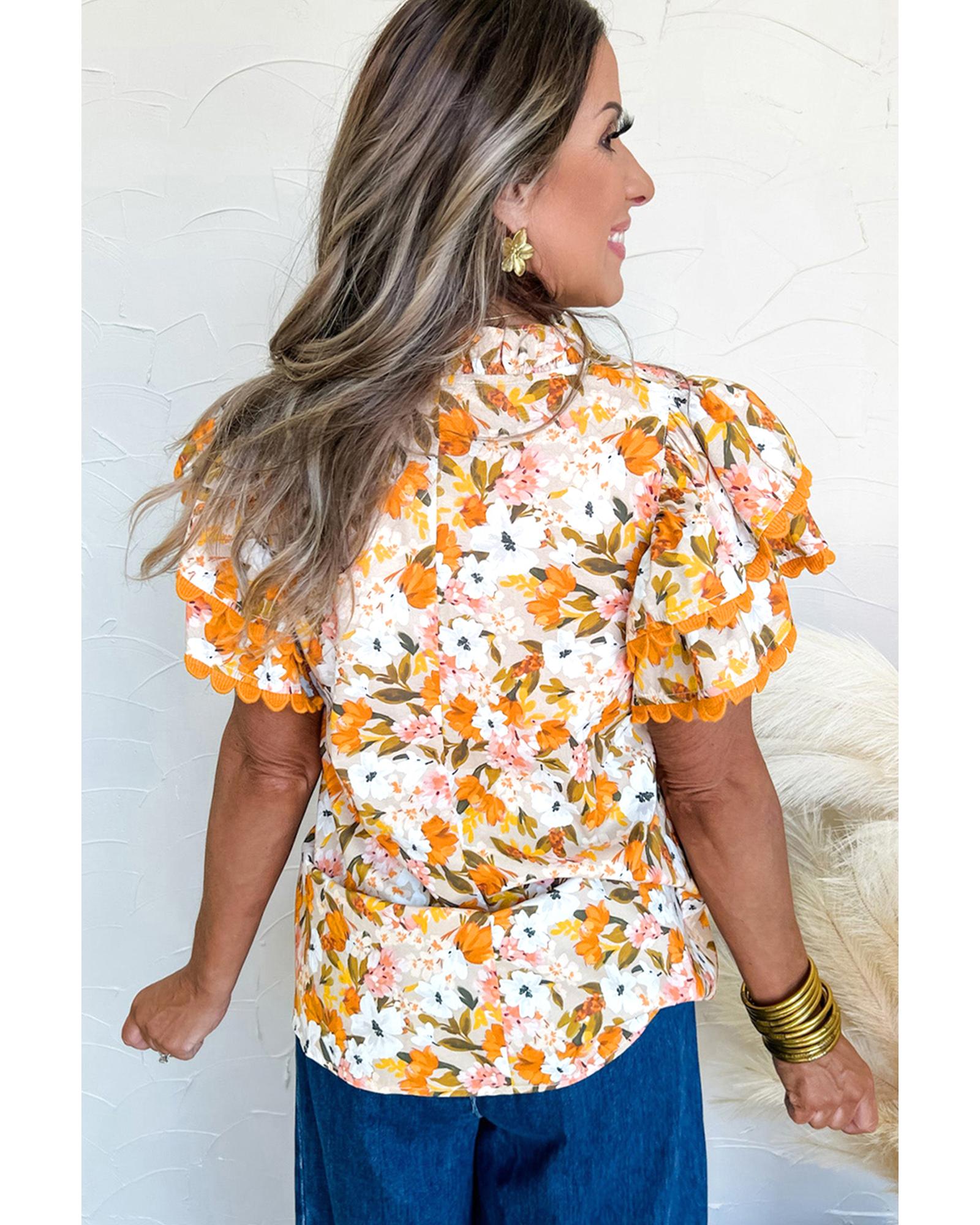 Russet Orange Ruffled V Neck Scalloped Short Sleeve Floral Blouse – L