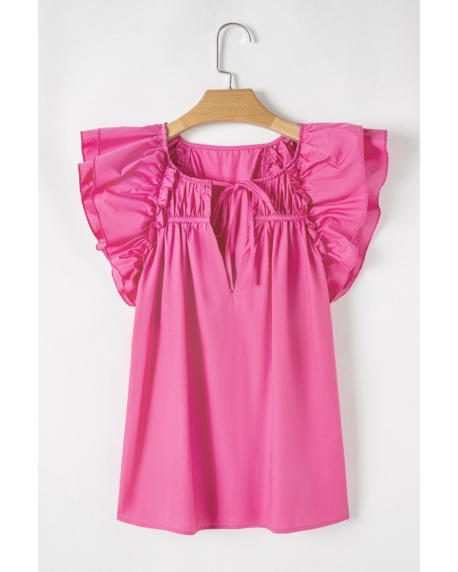 • Sachet Pink Shirred Yoke Lace up V Neck Ruffled Sleeve Blouse