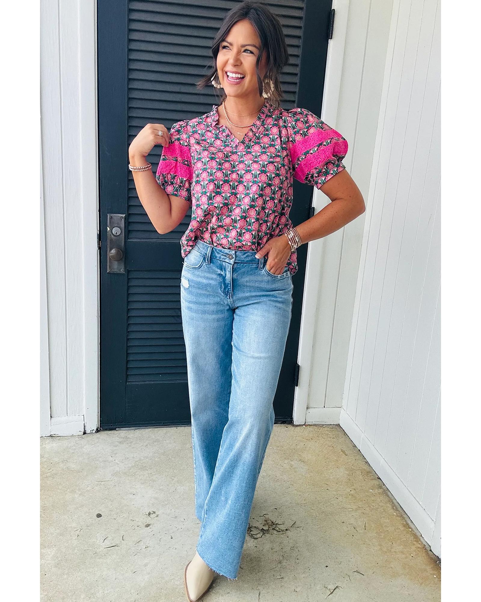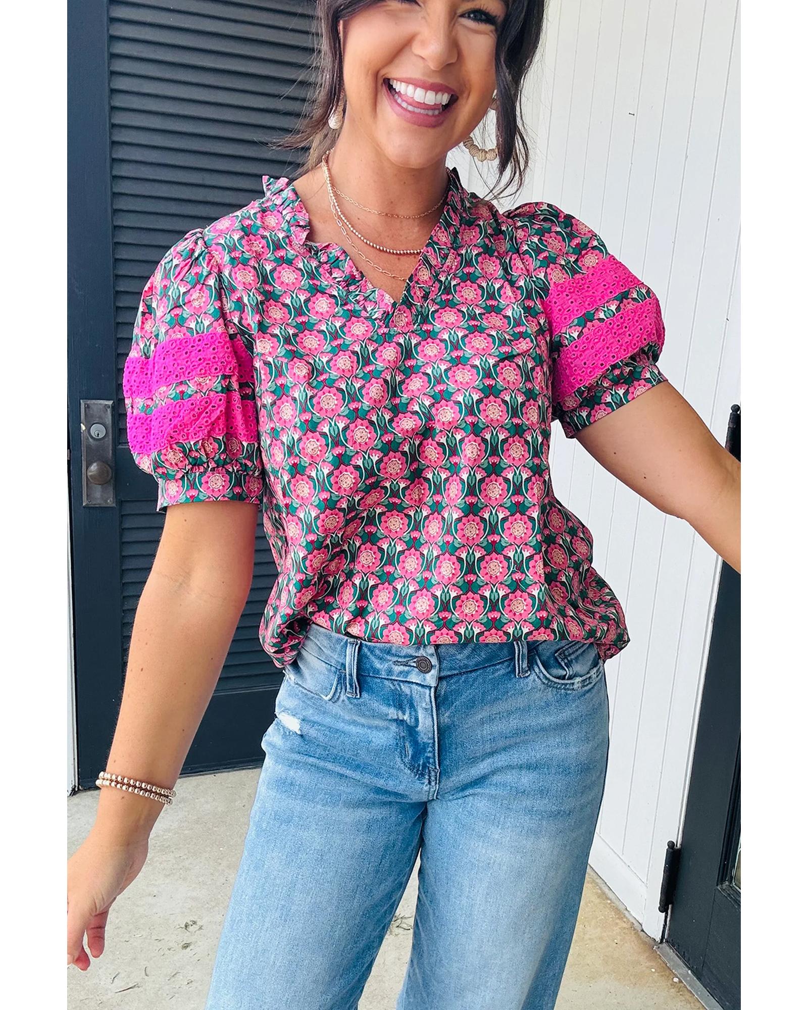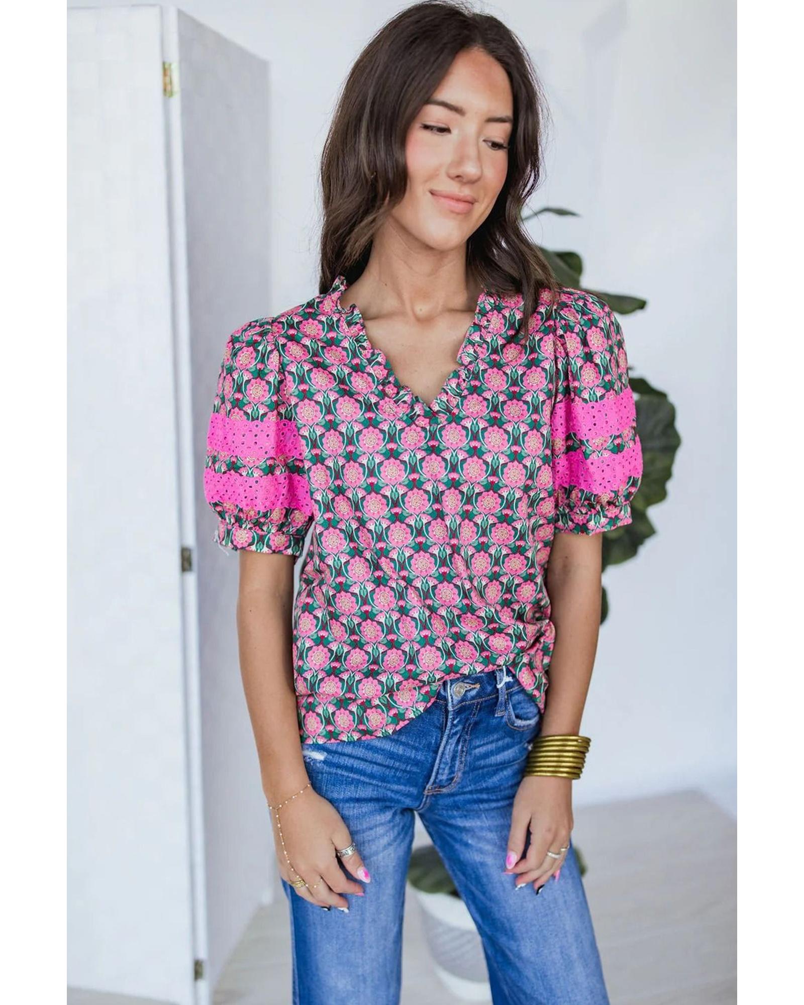 Sachet Pink V-Neck Ruffle Abstract Floral Print Puff Sleeve Top – L