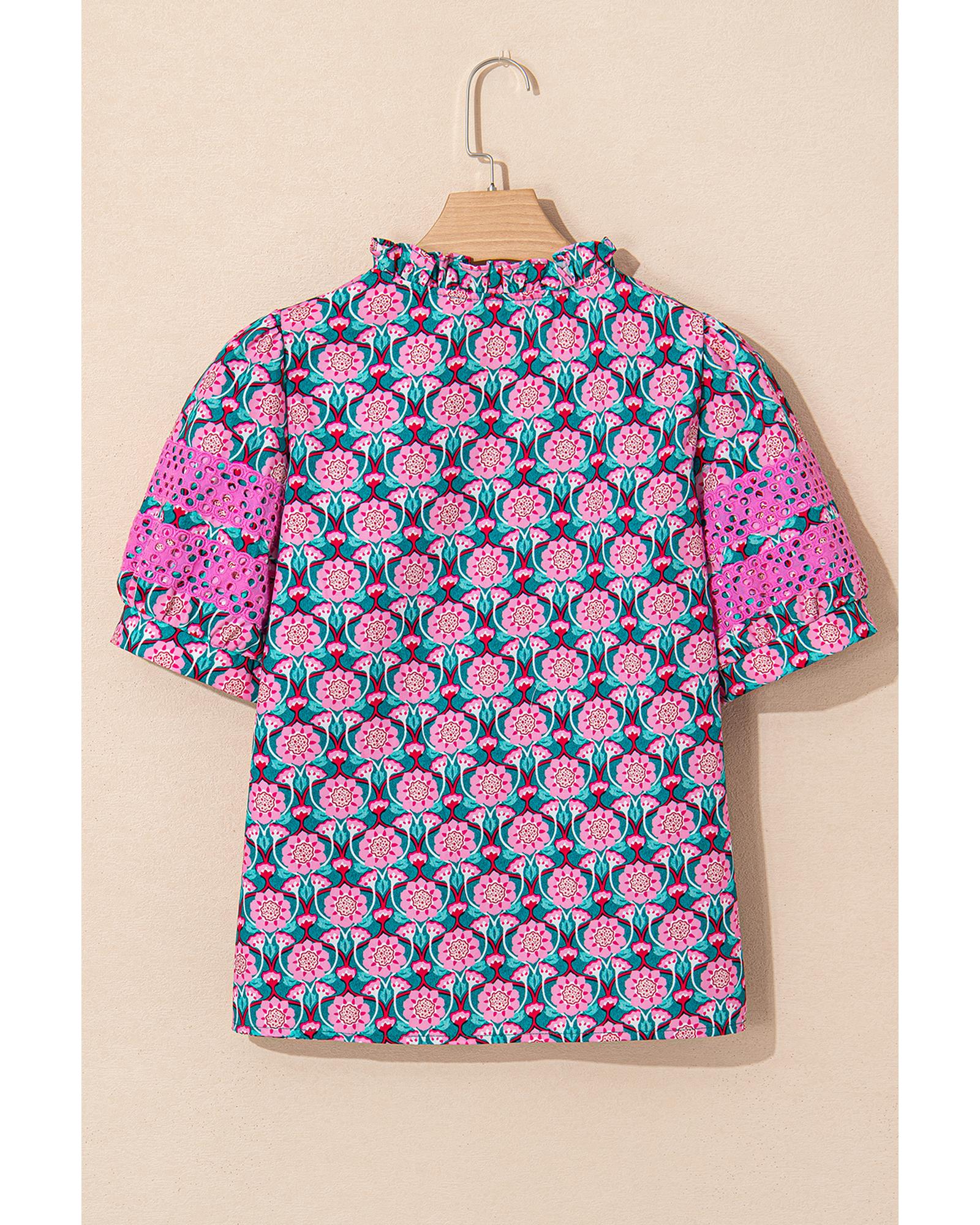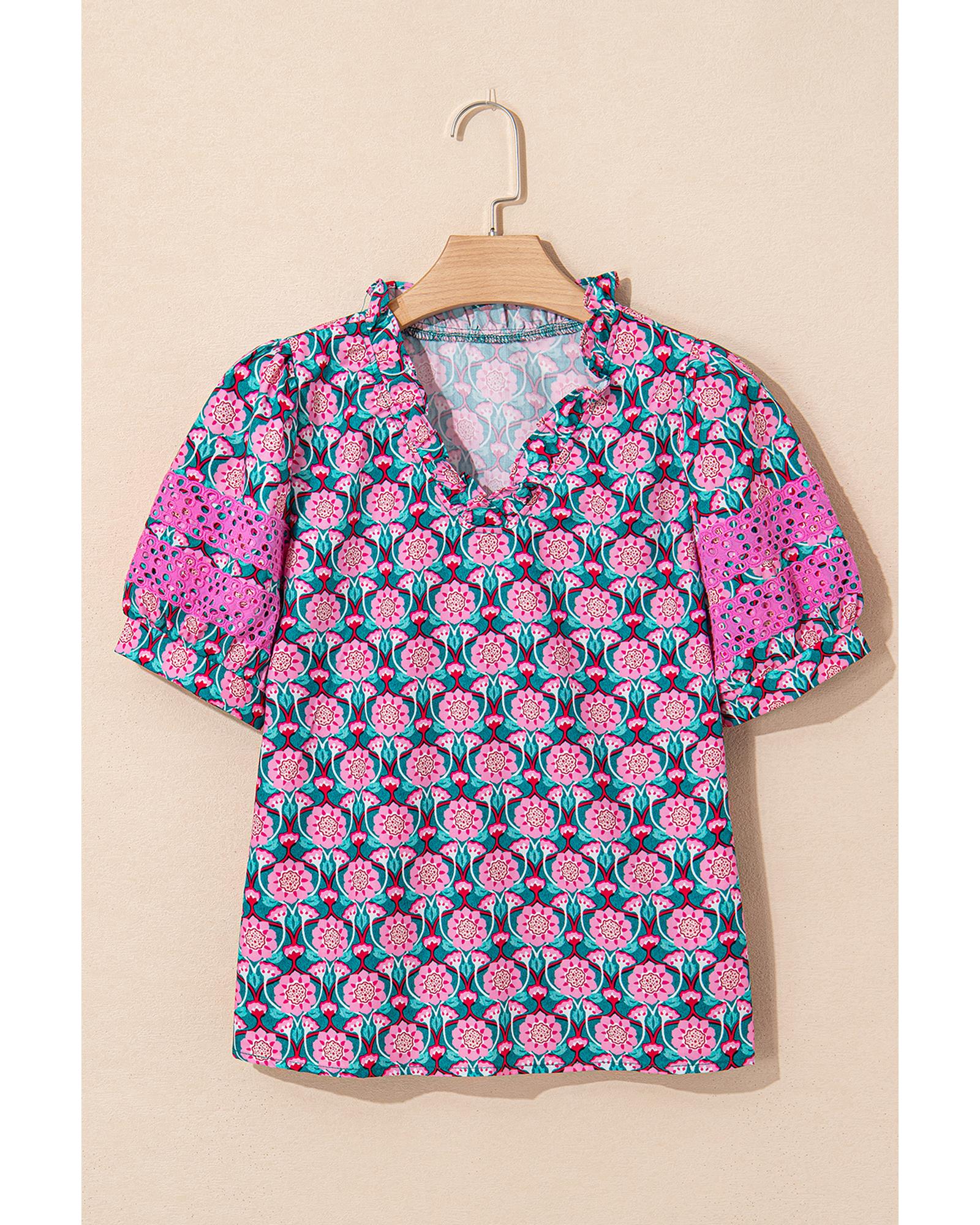 - Neck Ruffle Abstract Floral Print Puff Sleeve Top