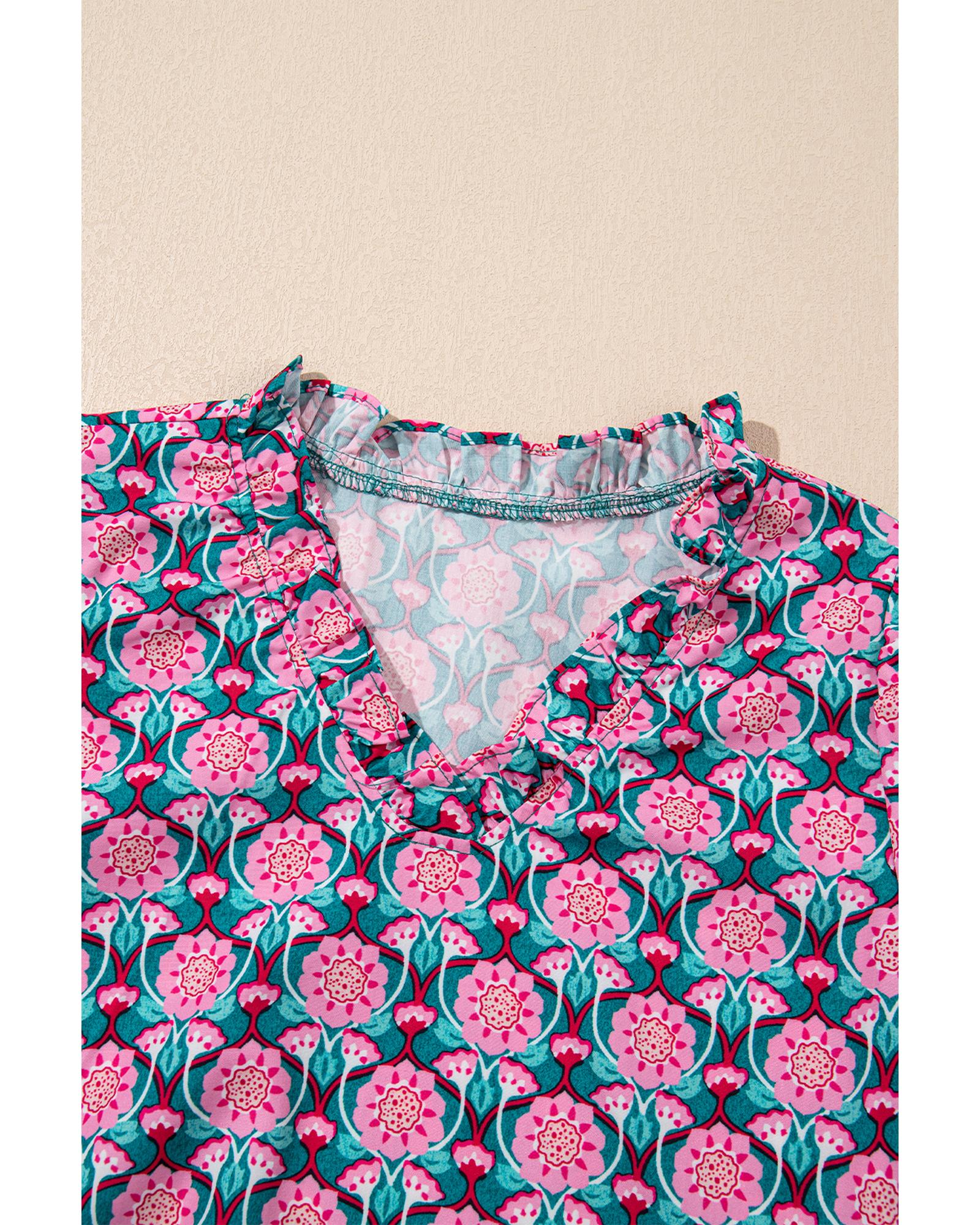 - Neck Ruffle Abstract Floral Print Puff Sleeve Top