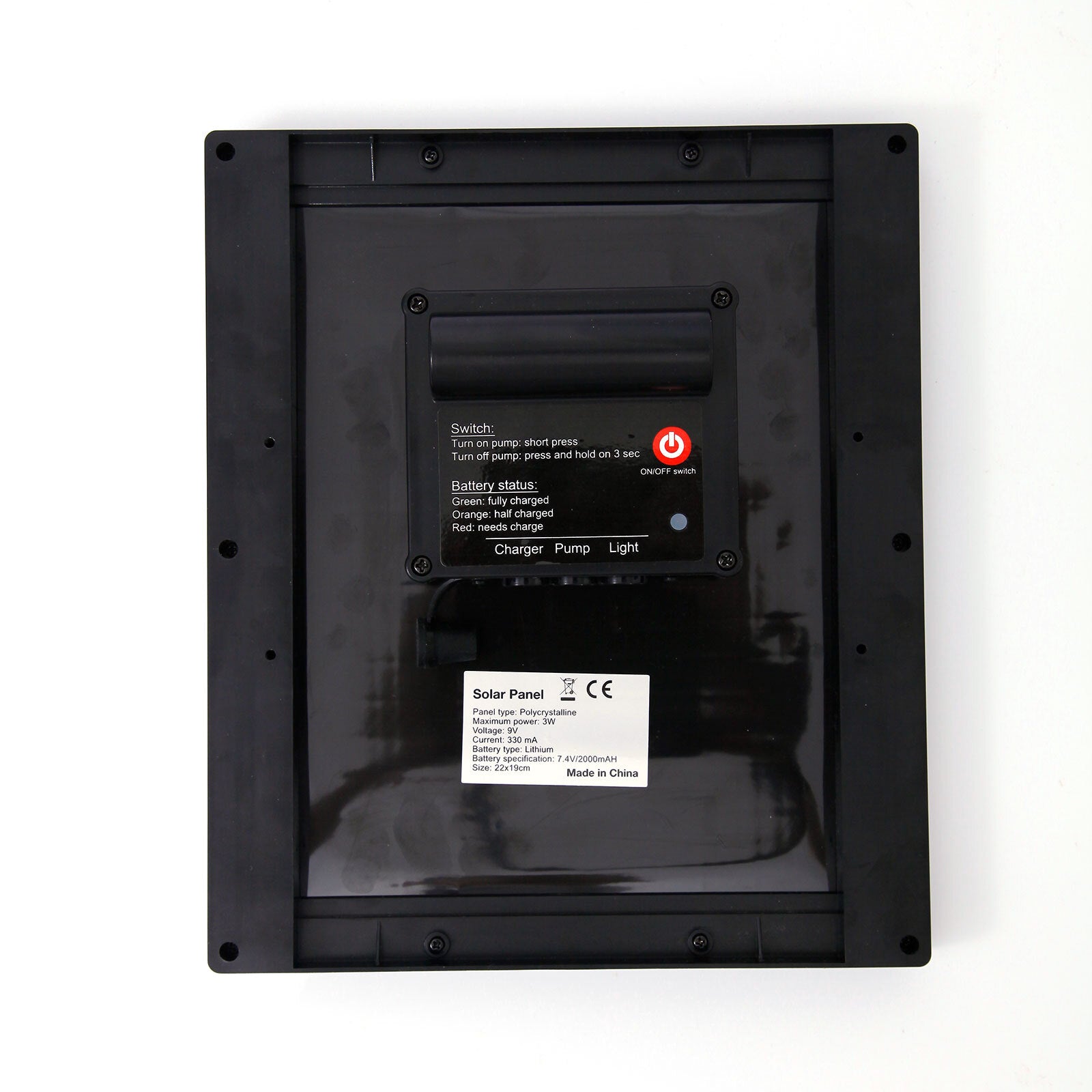 1x 3W solar panel with 7.4V-2000mAH Lithium battery controller at back