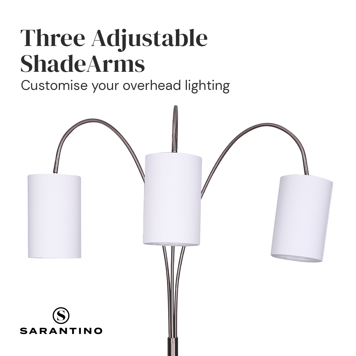 A smart and stylish way to light up a seating area, this 3-arm arc lamp provides overhead lighting that can be controlled with three adjustable shade arms. Aside from functional assets, a brushed steel finish is paired with a white marble base to display striking style.