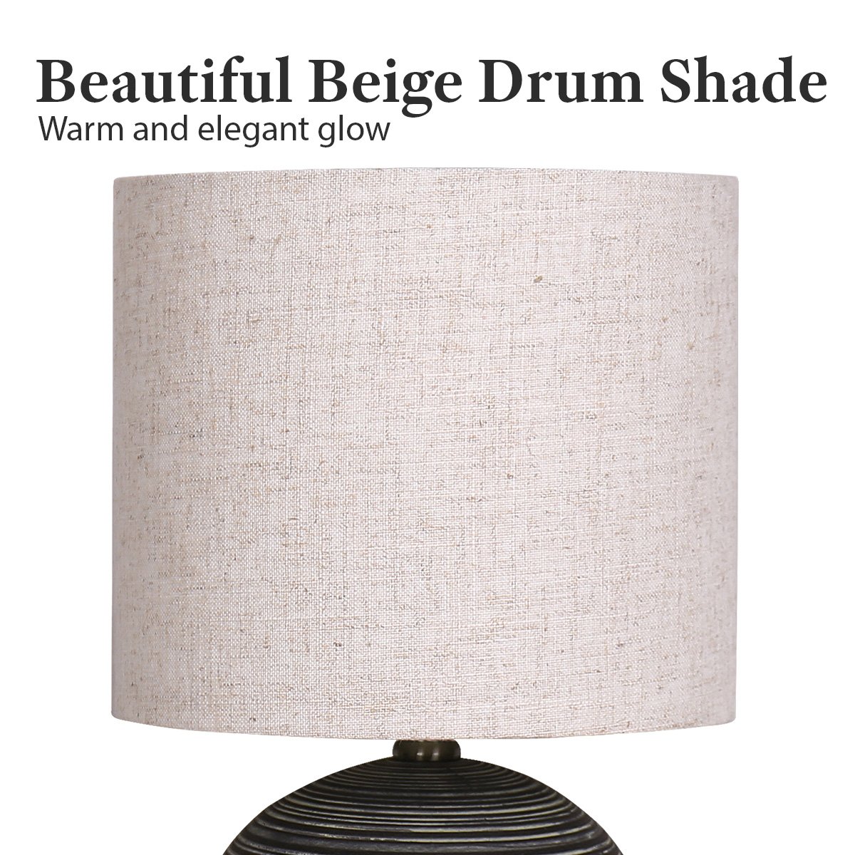 Contemporary, chic and aesthetically pleasing, this ceramic table lamp simply exudes elegance and charm. With a ceramic globe base, adorned with a captivating striped pattern, this lamp brings a touch of sophistication to any space. Topped with a warm beige drum shade, it emits a soft, inviting glow. The antique black colour adds a timeless allure, making it a perfect addition to both modern and classic interiors. Illuminate your surroundings with grace and style.