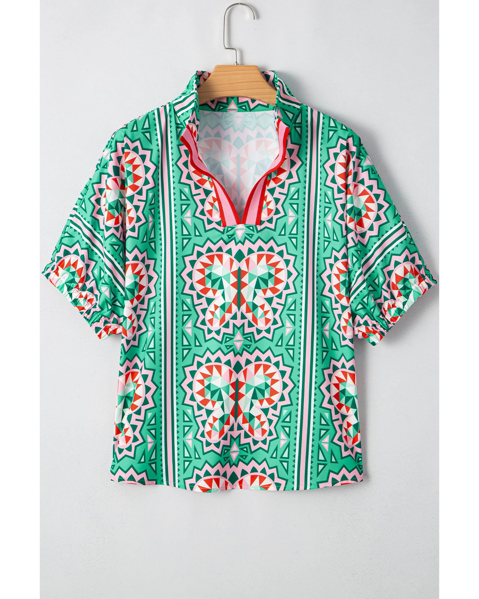 Sea Green Boho Abstract Print Contrast Striped Collared V Neck Blouse – L