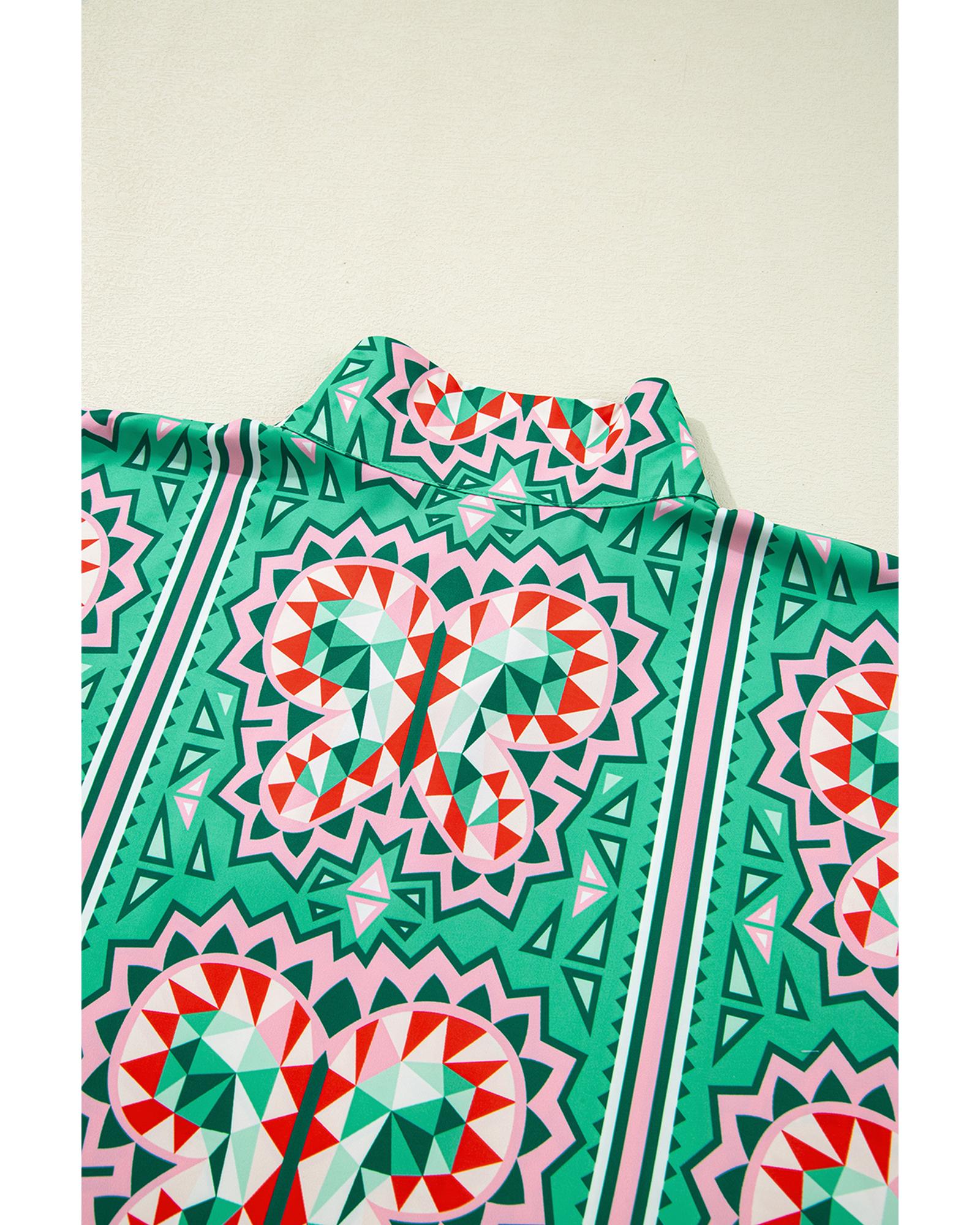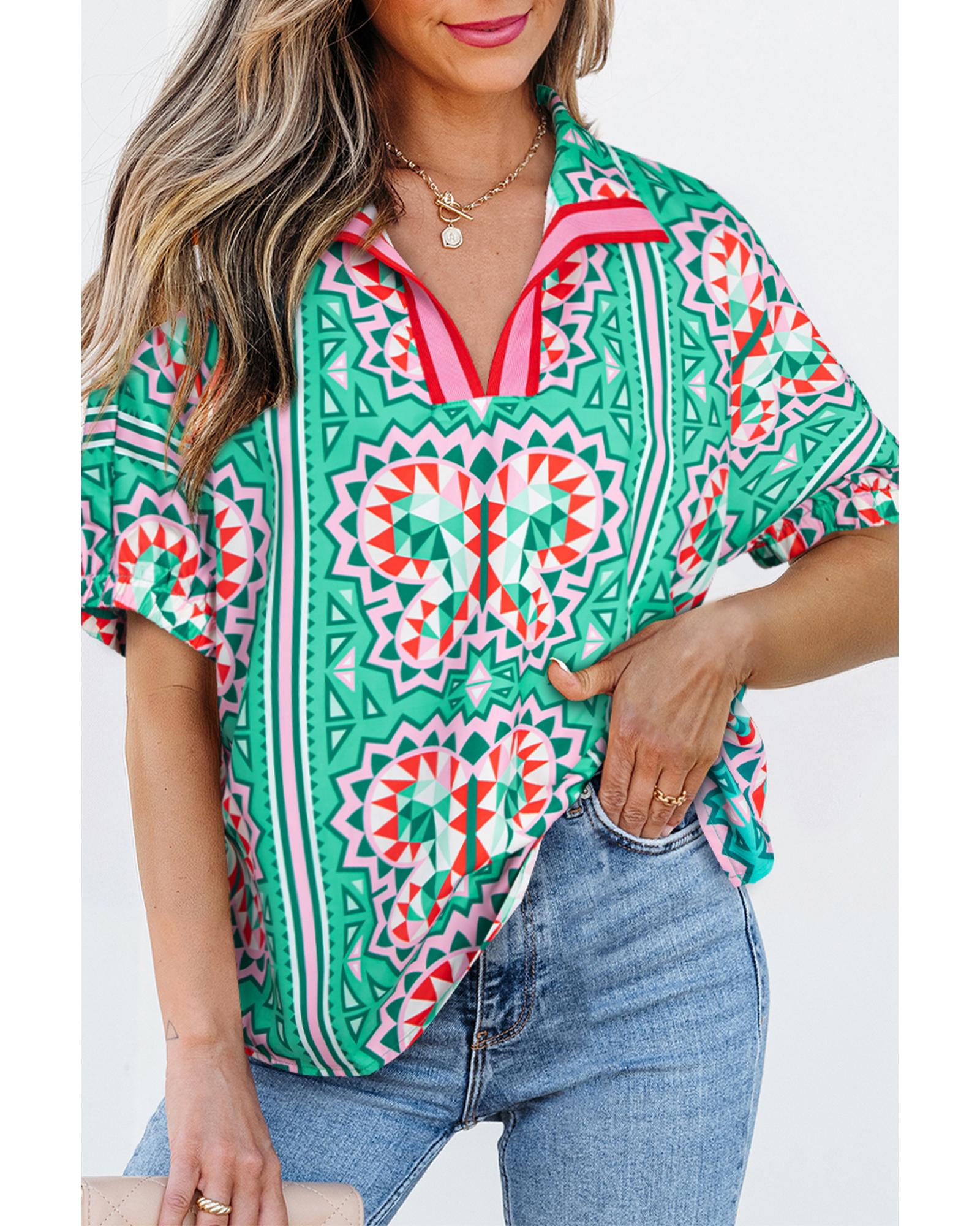 Sea Green Boho Abstract Print Contrast Striped Collared V Neck Blouse – S