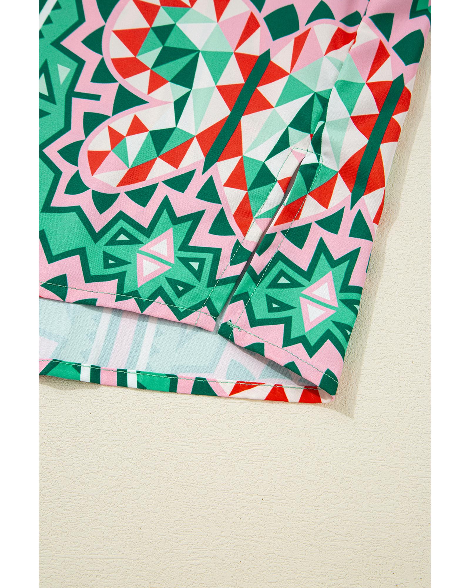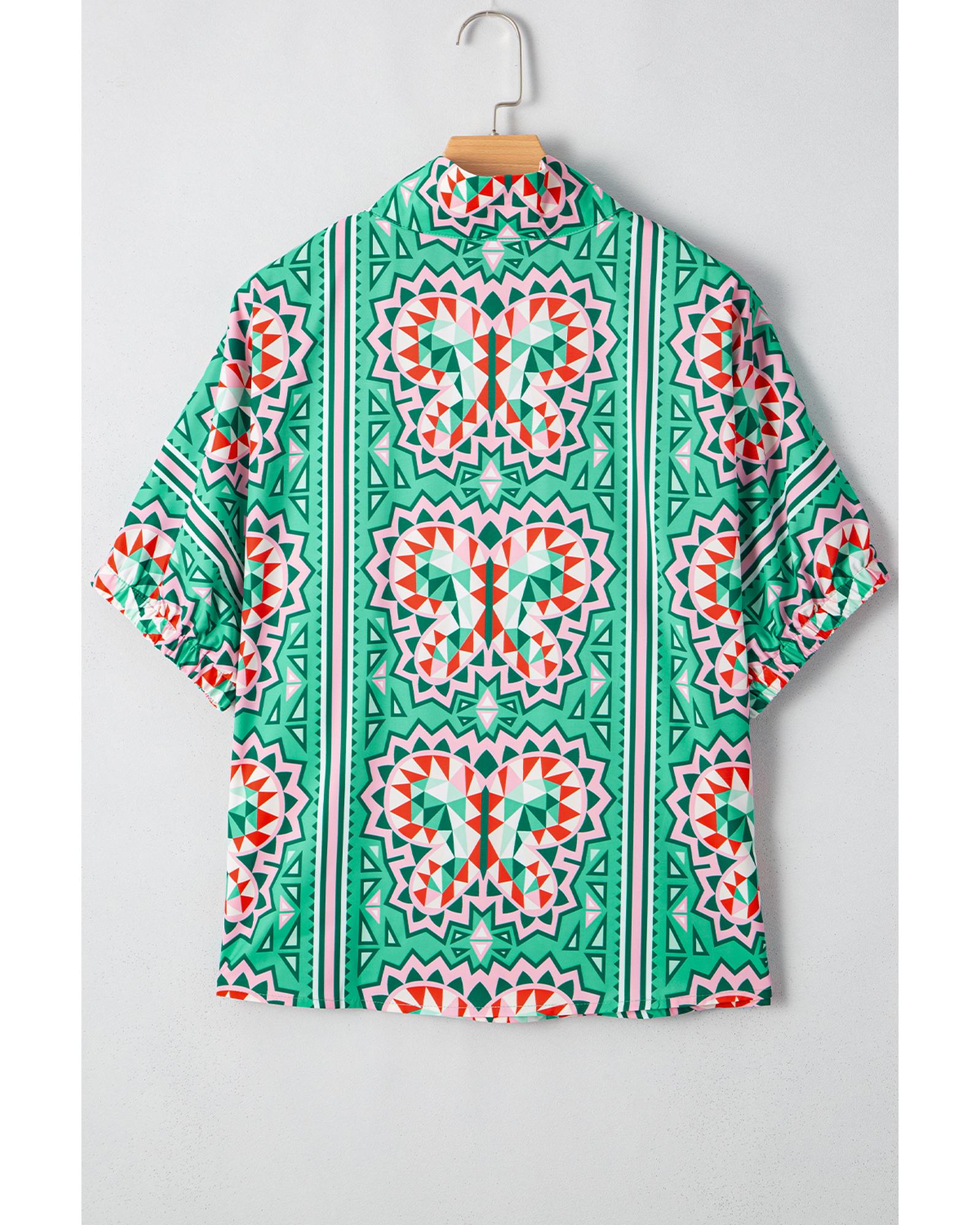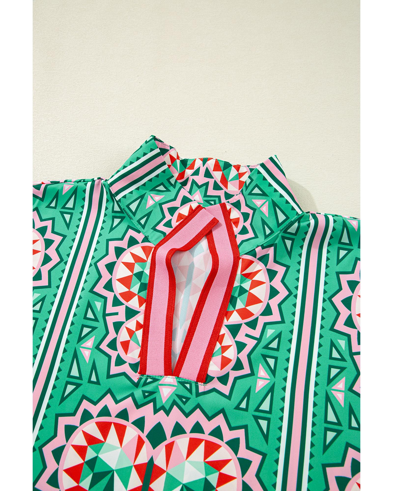 Sea Green Boho Abstract Print Contrast Striped Collared V Neck Blouse – XL