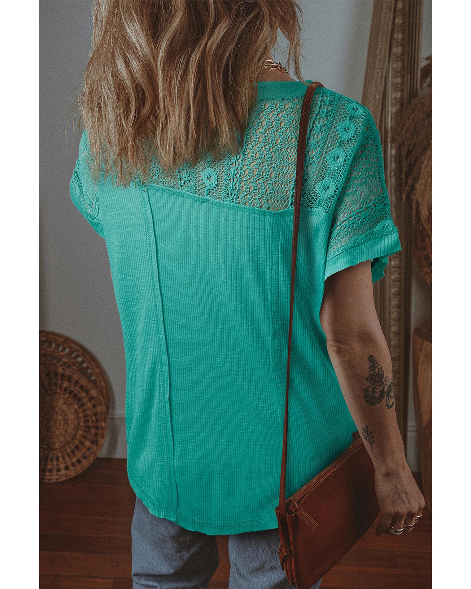 • Sea Green Lace Patchwork Split Neck Textured Short Sleeve Blouse