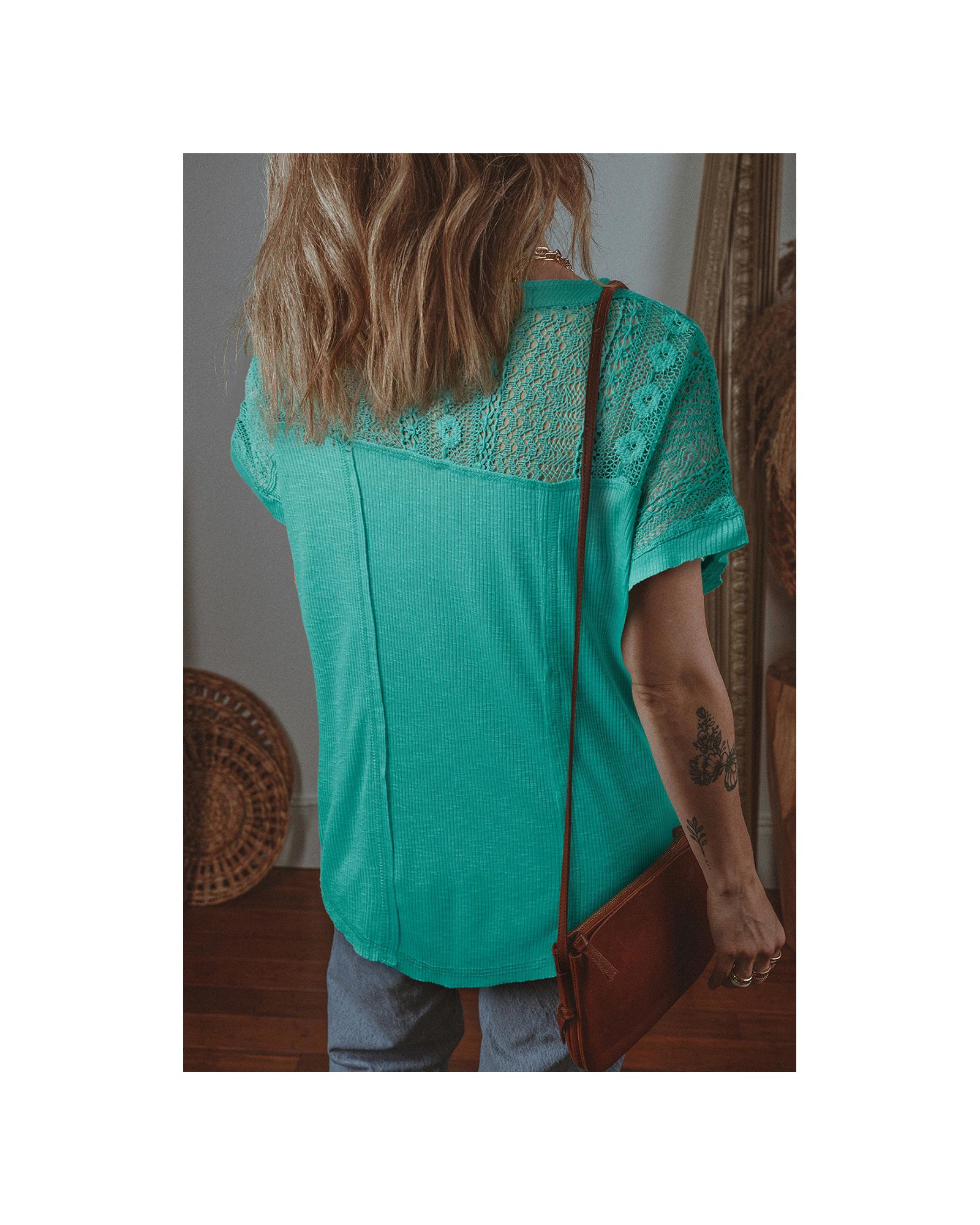- Sea Green Lace Patchwork Split Neck Textured Short Sleeve Blouse
