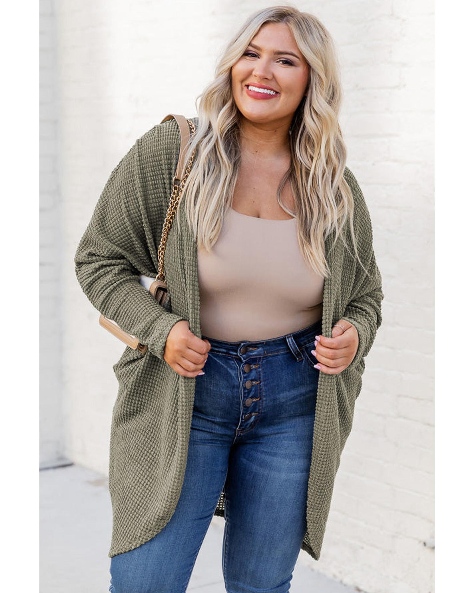Seagrass Waffle Knit Drop Shoulder Open Front Pocketed Plus Size Cardigan – 1X