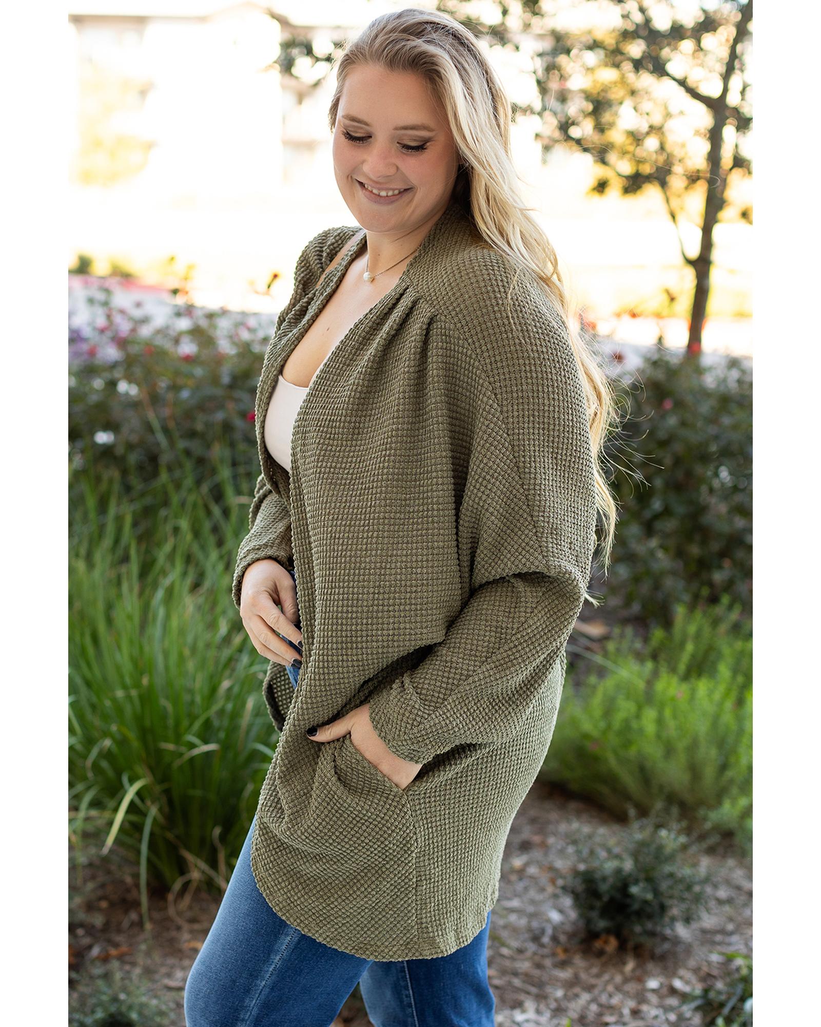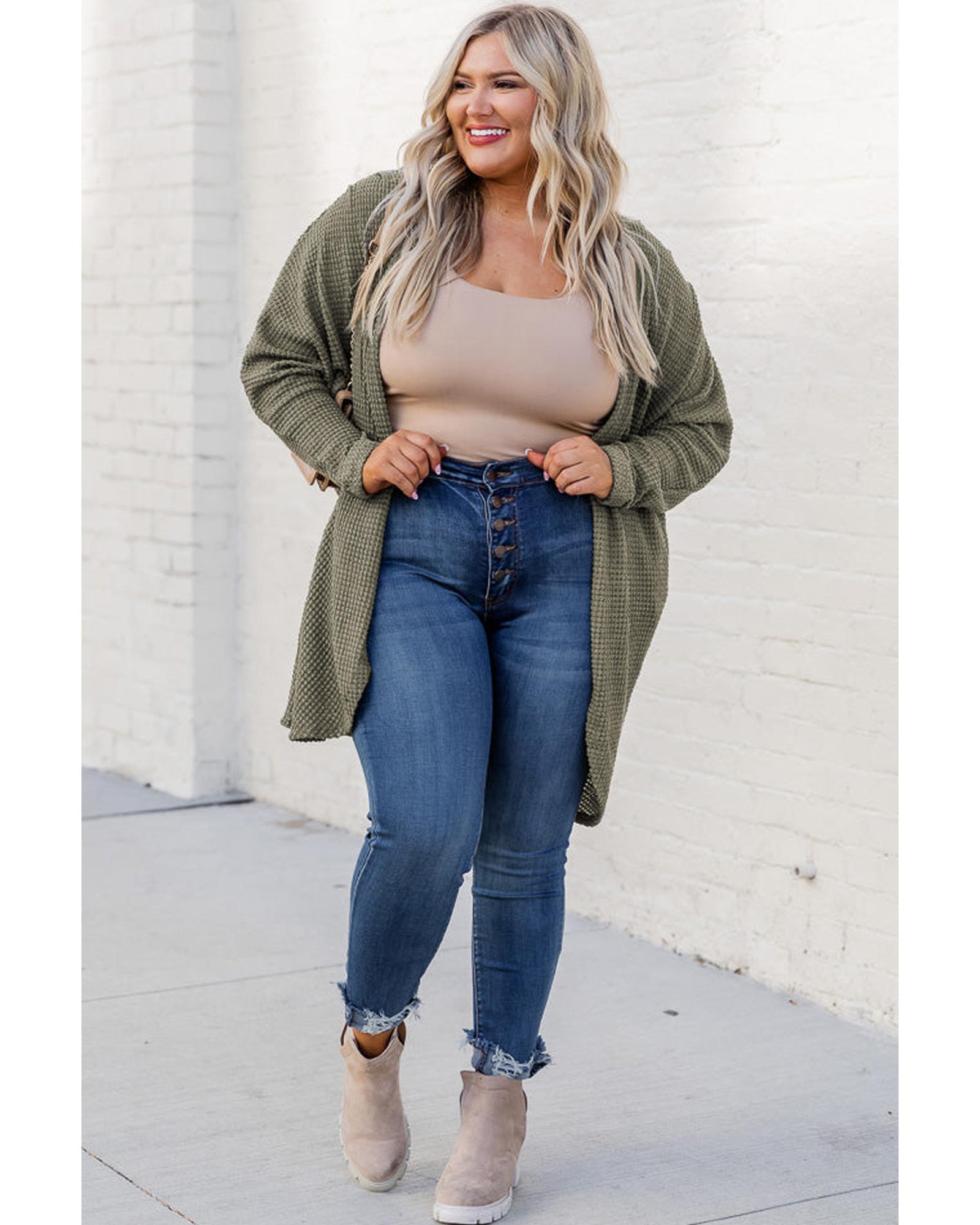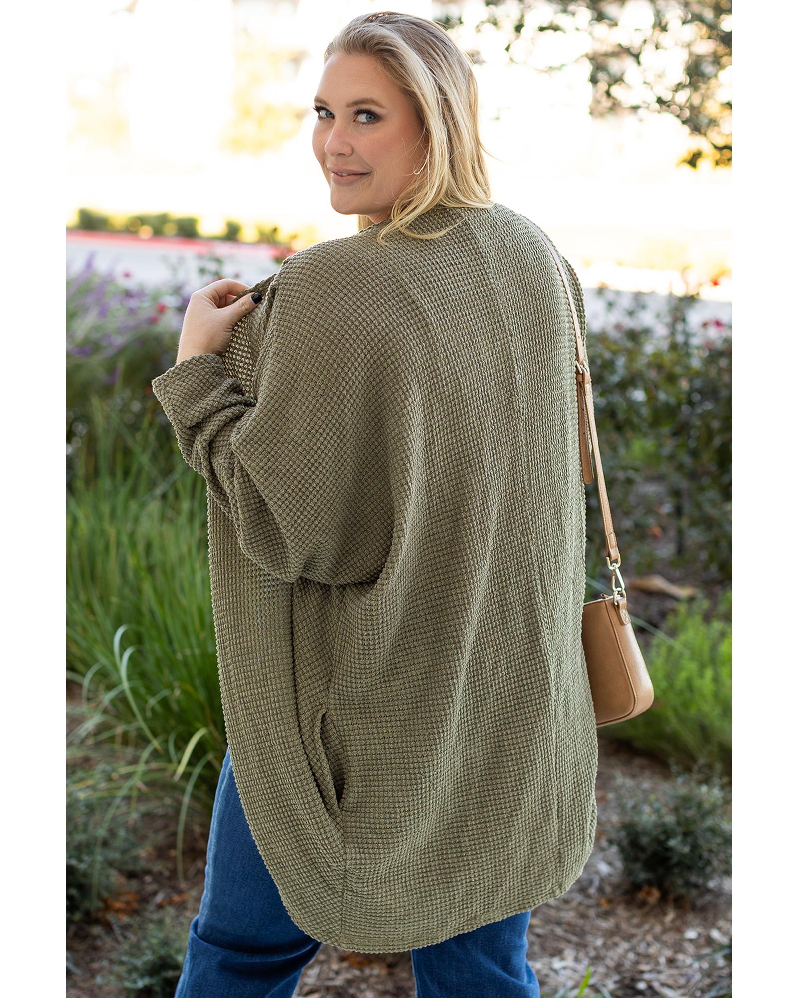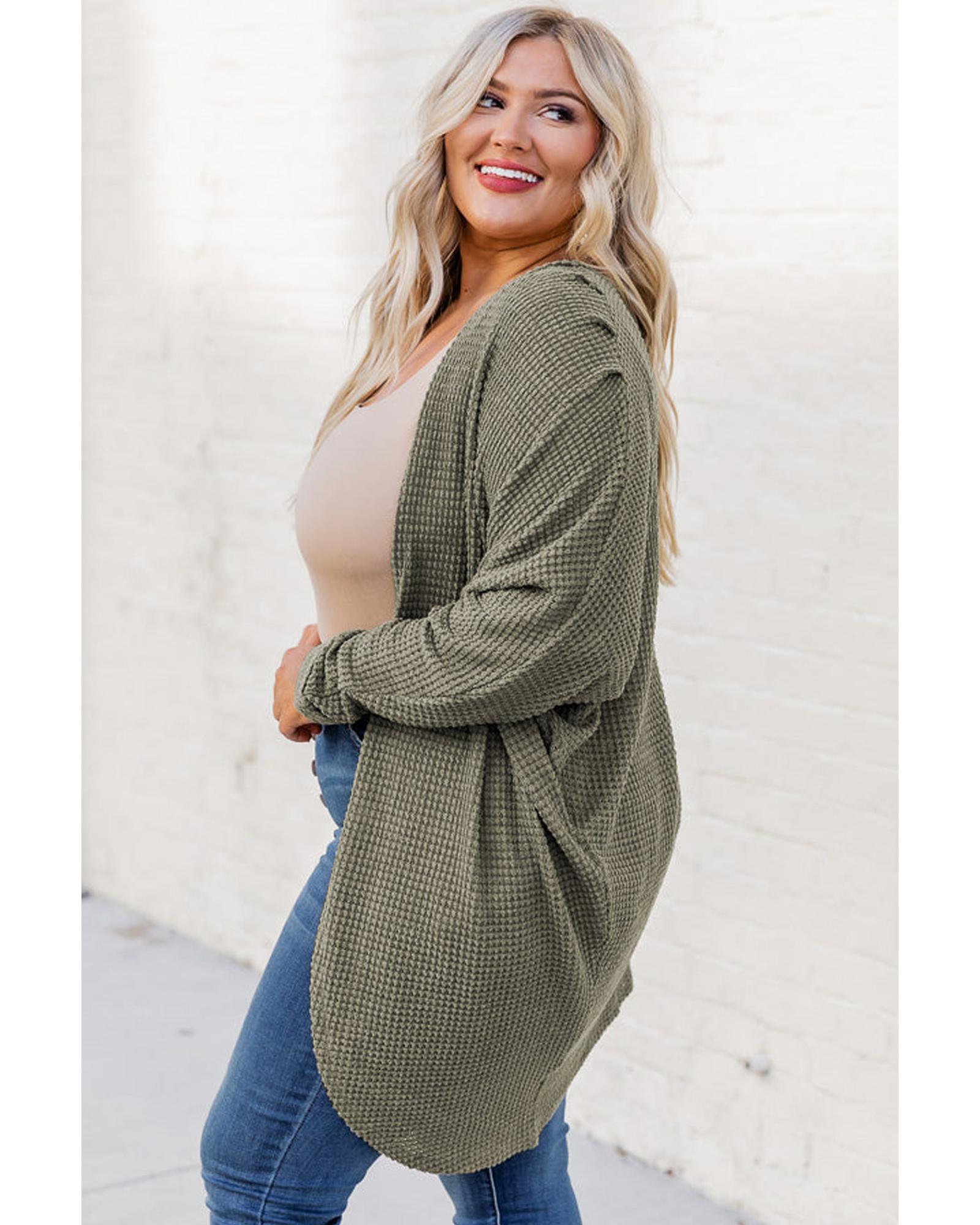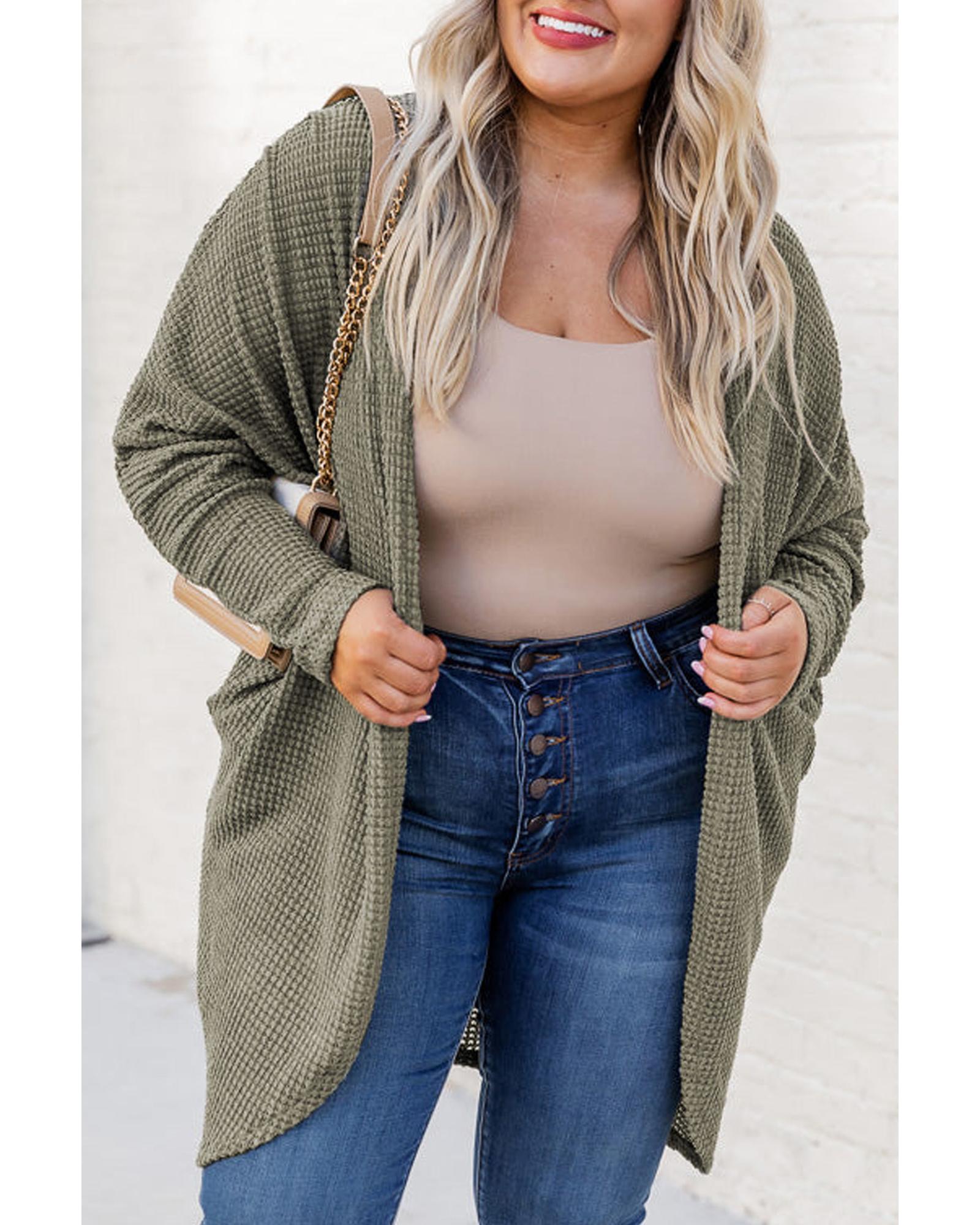 Seagrass Waffle Knit Drop Shoulder Open Front Pocketed Plus Size Cardigan – 2X