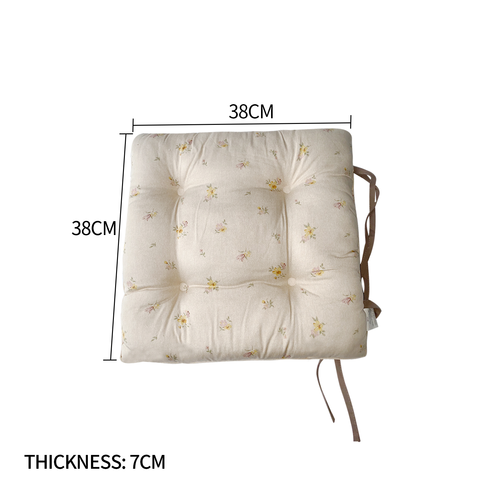 The square cushion has 2 straps on one side. The cushion is not detachable without a cover. The surface material is cotton and filling is polyester.