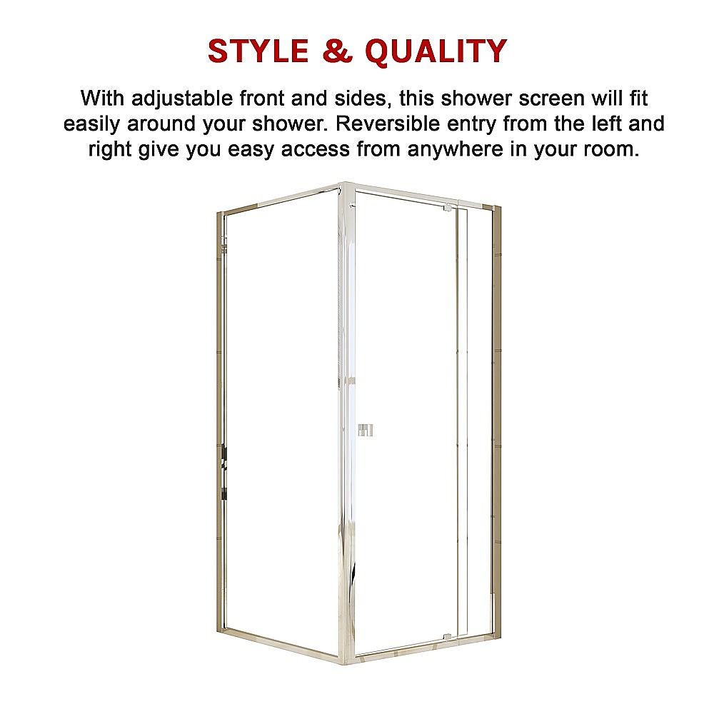 With adjustable front and sides, this shower screen will fit easily around your shower. Reversible entry from the left and right give you easy access from anywhere in your room. Make this elegant shower screen the centrepiece of your bathroom today.