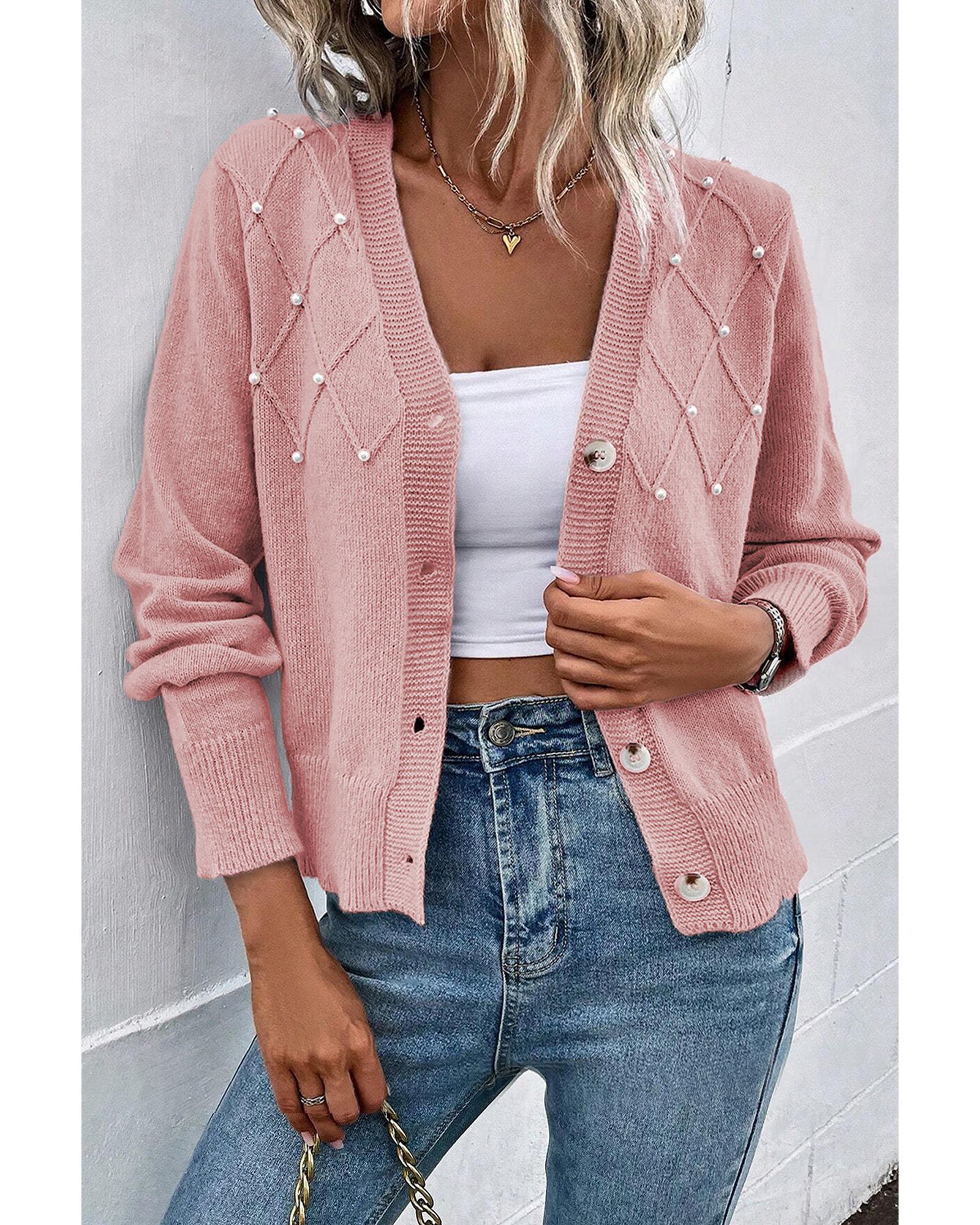 • Sepia Rose Textured Knit Pearl Beaded Button Up Cardigan